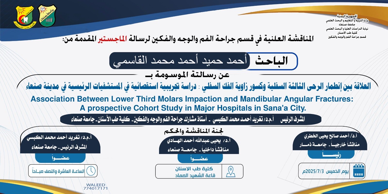 نال الباحث بدر حسن محمد قائد درجة الماجستير في قسم تقويم الأسنان – كلية طب الأسنان، جامعة صنعاء، عن رسالته الموسومة بـ: «التقييم الثلاثي الأبعاد لعرض القوس القاعدي للفكين وميلان الأرحاء في البالغين اليمنيين (Three-Dimensional Evaluation of Transverse Basal Arch …