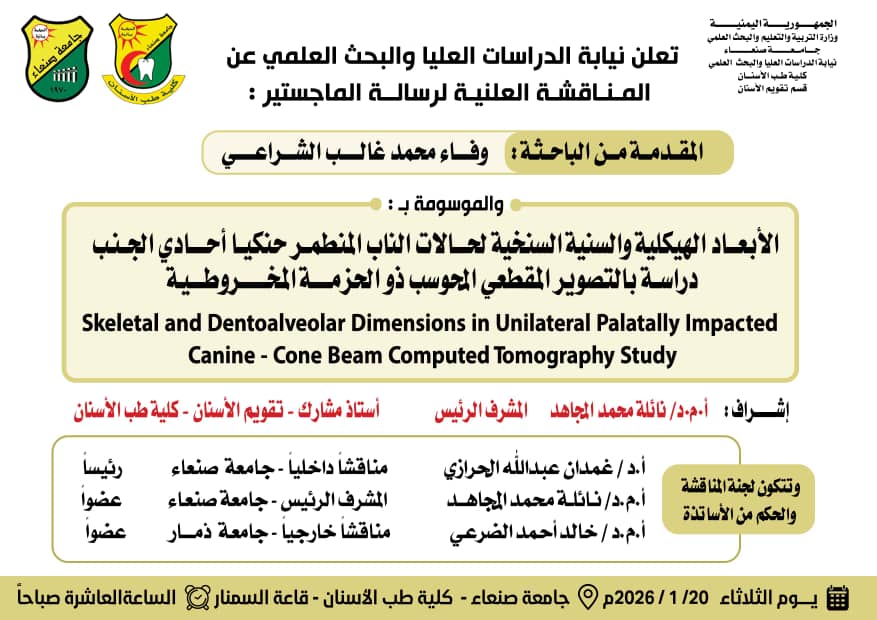نالت الباحثة وفاء محمد غالب الشراعي درجة الماجستير في قسم تقويم الأسنان، كلية طب الأسنان بجامعة صنعاء، عن رسالتها الموسومة بـ “الأبعاد الهيكلية والسنية السنخية لحالات الناب المنطمر حنكيًا أحادي الجنب دراسة بالتصوير المقطعي المحوسب ذو الحزمة المخروطية”. وتكوّنت لجنة …