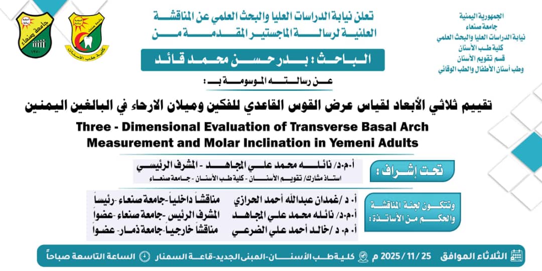 نال الباحث بدر حسن محمد قائد درجة الماجستير في قسم تقويم الأسنان – كلية طب الأسنان، جامعة صنعاء، عن رسالته الموسومة بـ: «التقييم الثلاثي الأبعاد لعرض القوس القاعدي للفكين وميلان الأرحاء في البالغين اليمنيين (Three-Dimensional Evaluation of Transverse Basal Arch …