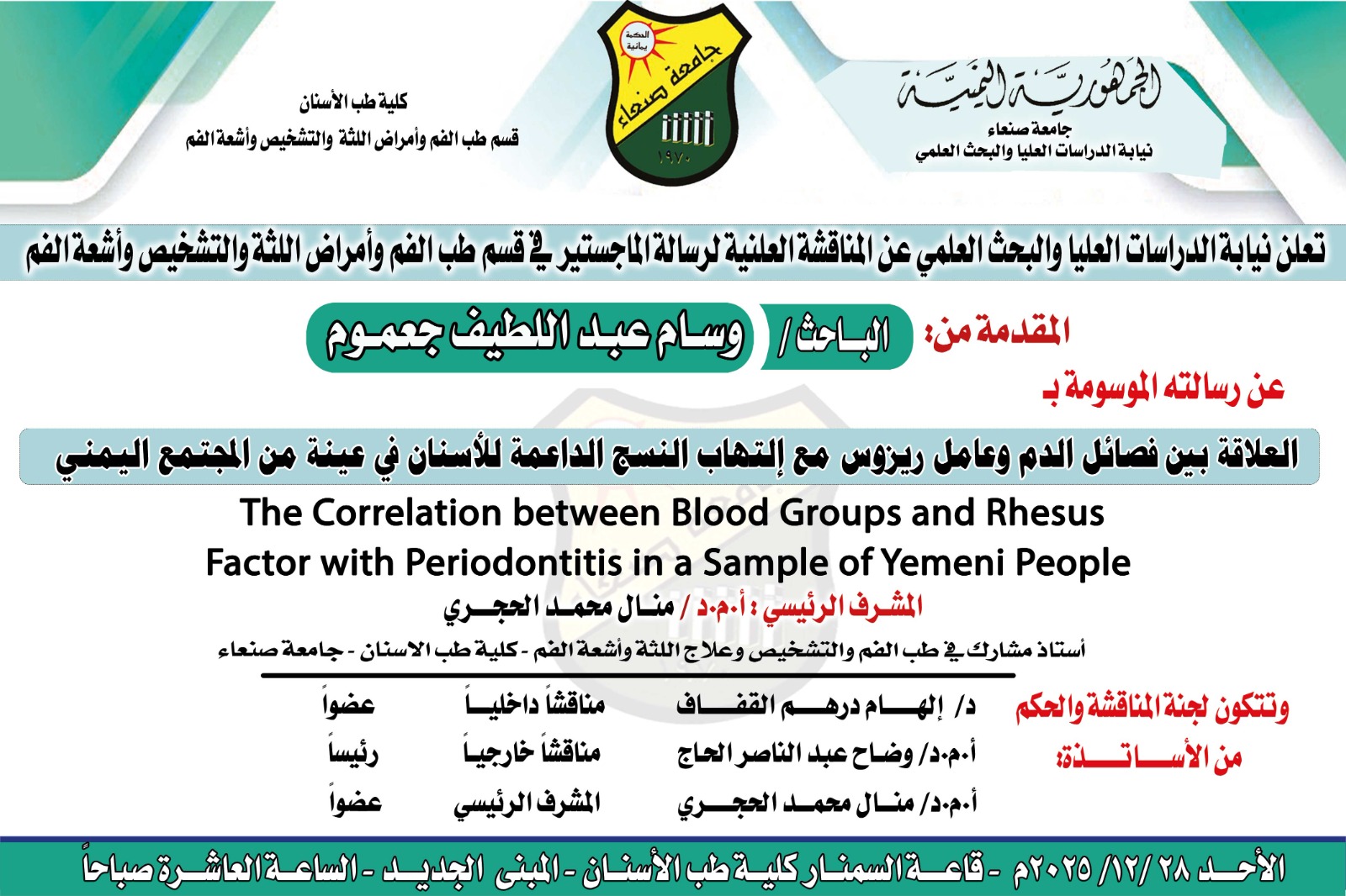 نـال الباحث وسام عبداللطيف جعموم درجة الماجستير في قسم طب الفم وأمراض اللثة والتشخيص وأشعة الفم، كلية طب الأسنان بجامعة صنعاء، عن رسالته الموسومة بـ: “العلاقة بين فصائل الدم وعامل ريزوس مع التهاب النسج الداعمة للأسنان في عينة من المجتمع …