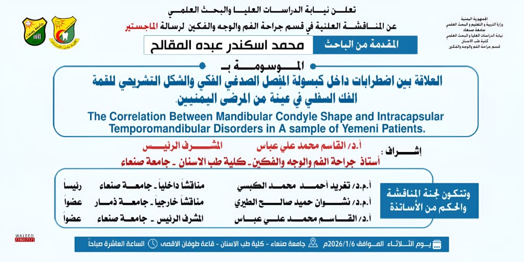 نالت الباحثة إشراق عبدربه مانع علي الصيح درجة الماجستير في قسم تقويم الأسنان، كلية طب الأسنان بجامعة صنعاء، عن رسالتها الموسومة بـ: (تقييم العلاقة بين ثنايا الفك العلوي المركزية والقناة القاطعة: دراسة بالتصوير الشعاعي المخروطي المحوسب). وذلك يوم الخميس 27 …