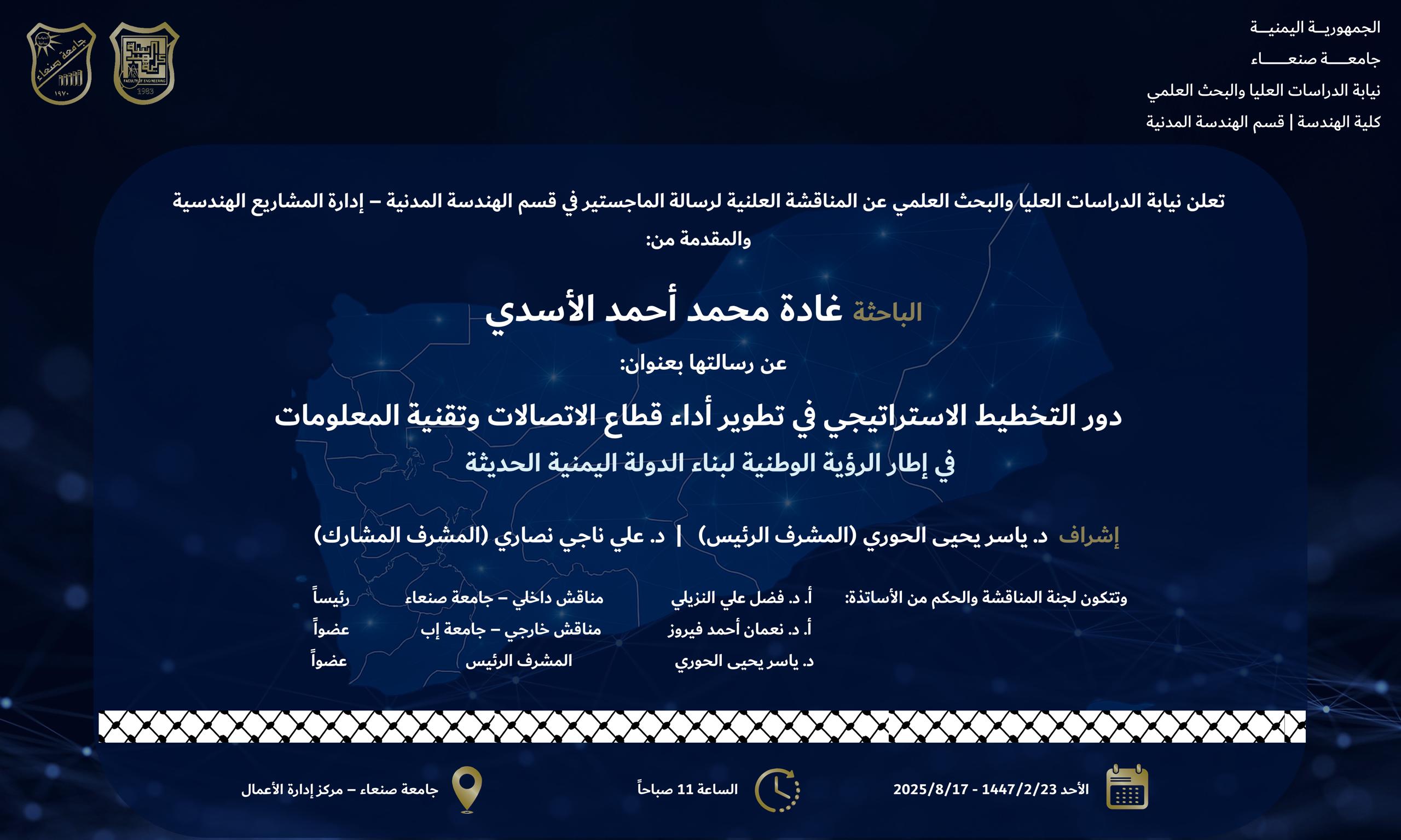 تعلن نيابة الدراسات العليا والبحث العلمي عن المناقشة العلنية لرسالة الماجستير المقدمة من الباحثة: غادة محمد أحمد الأسدي عن رسالتها الموسومة بـ: ” دور التخطيط الإسترتيجي في تطوير أداء قطاع الاتصالات وتقنية المعلومات في إطار الرؤية الوطنية لبناء الدولة اليمنية …