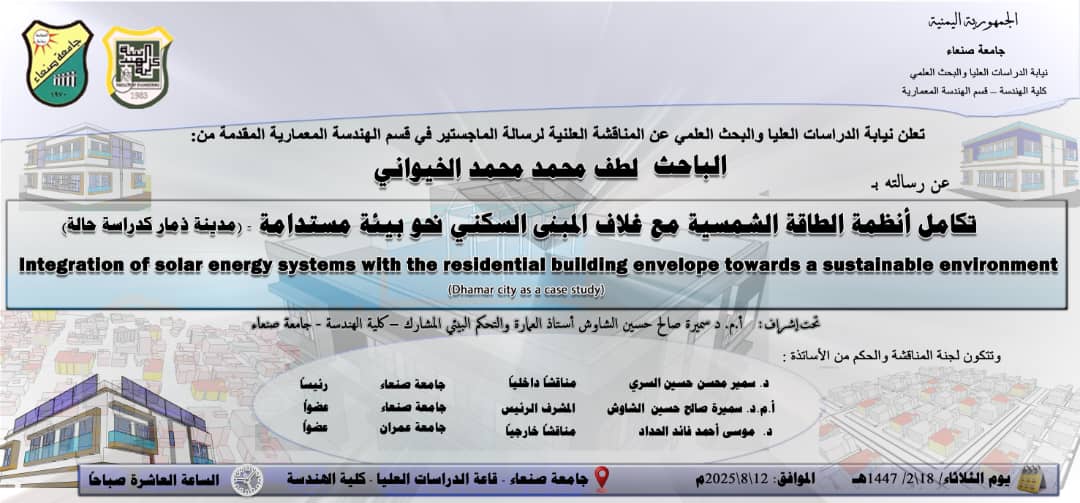 تعلن نيابة الدراسات العليا والبحث العلمي عن المناقشة العلنية لرسالة الماجستير المقدمة من الباحث: لطف محمد محمد الخيواني عن رسالته الموسومة بـ: تكامل أنظمة الطاقة الشمسية مع غلاف المبنى السكني نحو بيئة مستدامة (مدينة ذمار كدراسة حالة) Integration of solar …