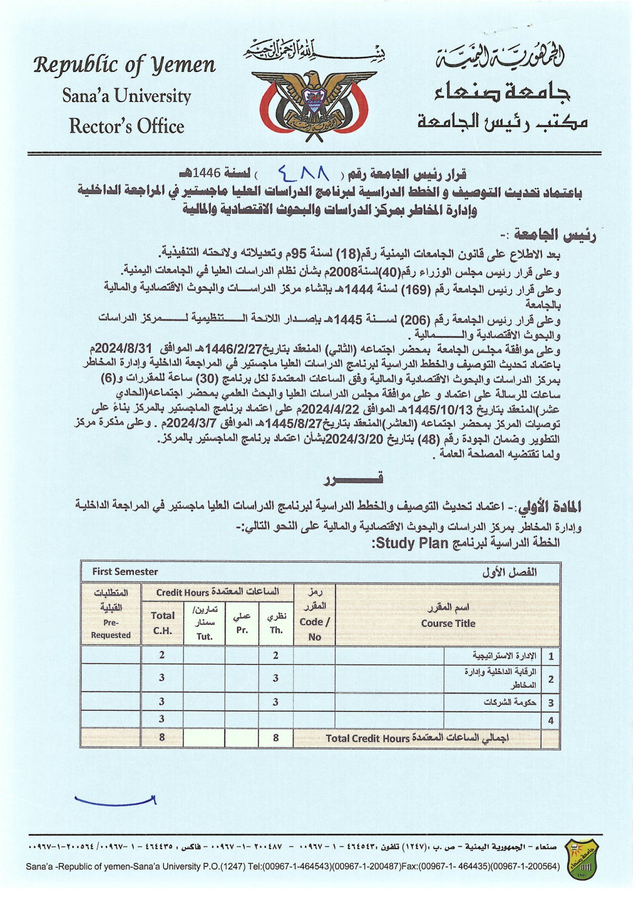 اعتماد تحديث التوصيف والخطط الدراسة لبرنامج ماجستير في المراجعة الداخلية وادارة المخاطر بجامعة صنعاء Posted by su_70_cefs التصنيفات الأخبار Date أبريل 8, 2025 صدر قرار رئيس جامعة صنعاء رقم (488) لسنة 1446 هـ باعتماد تحديث التوصيف والخطط الدراسة لبرنامج الدراسات العليا (ماجستير) في المراجعة الداخلية وادارة المخاطر بمركز الدراسات والبحوث. Share: su_70_cefs المقال السابق اعتماد تحديث التوصيف والخطط الدراسة لبرنامج ماجستير في التمويل والمصارف بجامعة صنعاء أبريل 8, 2025 المقال التالي إعلان عن مناقشة علنية لأطروحة دكتوراه في المحاسبة بمركز الدراسات والبحوث الاقتصادية والمالية أبريل 21, 2025 You may also like اختتام الدورة التدريبية الثانية لتعزيز كفاءة مسؤولي المواقع الإلكترونية بجامعة صنعاء 8 مارس, 2026 الاجتماع الدوري التاسع لمسؤولي المواقع الإلكترونية يقر تدشين “بريد الجامعة” وأرقام تواصل عبر الواتس آب والتليغرام عقب إجازة عيد الفطر 8 مارس, 2026 لجنة تقييم المراكز بجامعة صنعاء تزور مركز الدراسات والبحوث الاقتصادية والمالية للاطلاع على مستوى الأداء الأكاديمي والإداري 28 فبراير, 2026