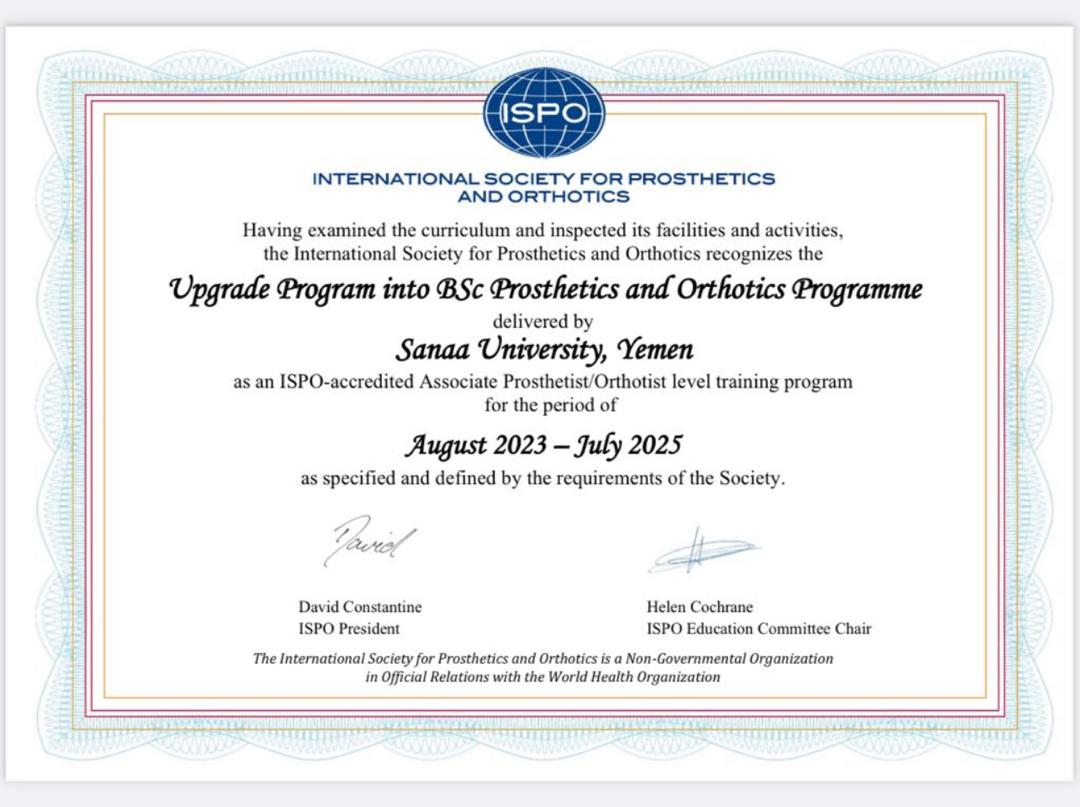 برنامج الأطراف الصناعية والتعويضية بكلية الطب والعلوم الصحية بجامعة صنعاء يحصل على الاعتماد والاعتراف الدولي (ISPO)