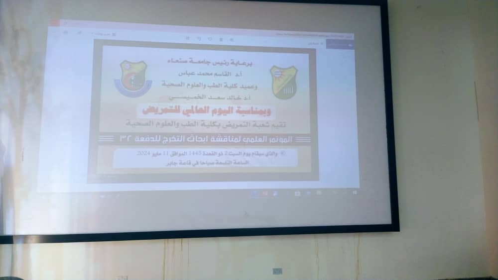 برعاية رئيس جامعة صنعاء الأستاذ الدكتور/ القاسم محمد عباس وعميد كلية الطب والعلوم الصحية الأستاذ الدكتور/ خالد الخميسي تم اليوم مناقشة أبحاث التخرج لخريجي برنامج التمريض الدفعة (32) بحضور نواب العميد وأعضاء هيئة التدريس بالبرنامج والخريجين، حيث أعرب عميد الكلية عن سعادته بحضور ورعاية الفعالية العلمية التي تعزز مكانة مخرجات برنامج التمريض الذين يمثلون رافداً بشرياً وعلمياً متميزاً في جميع مستشفيات الجمهورية .