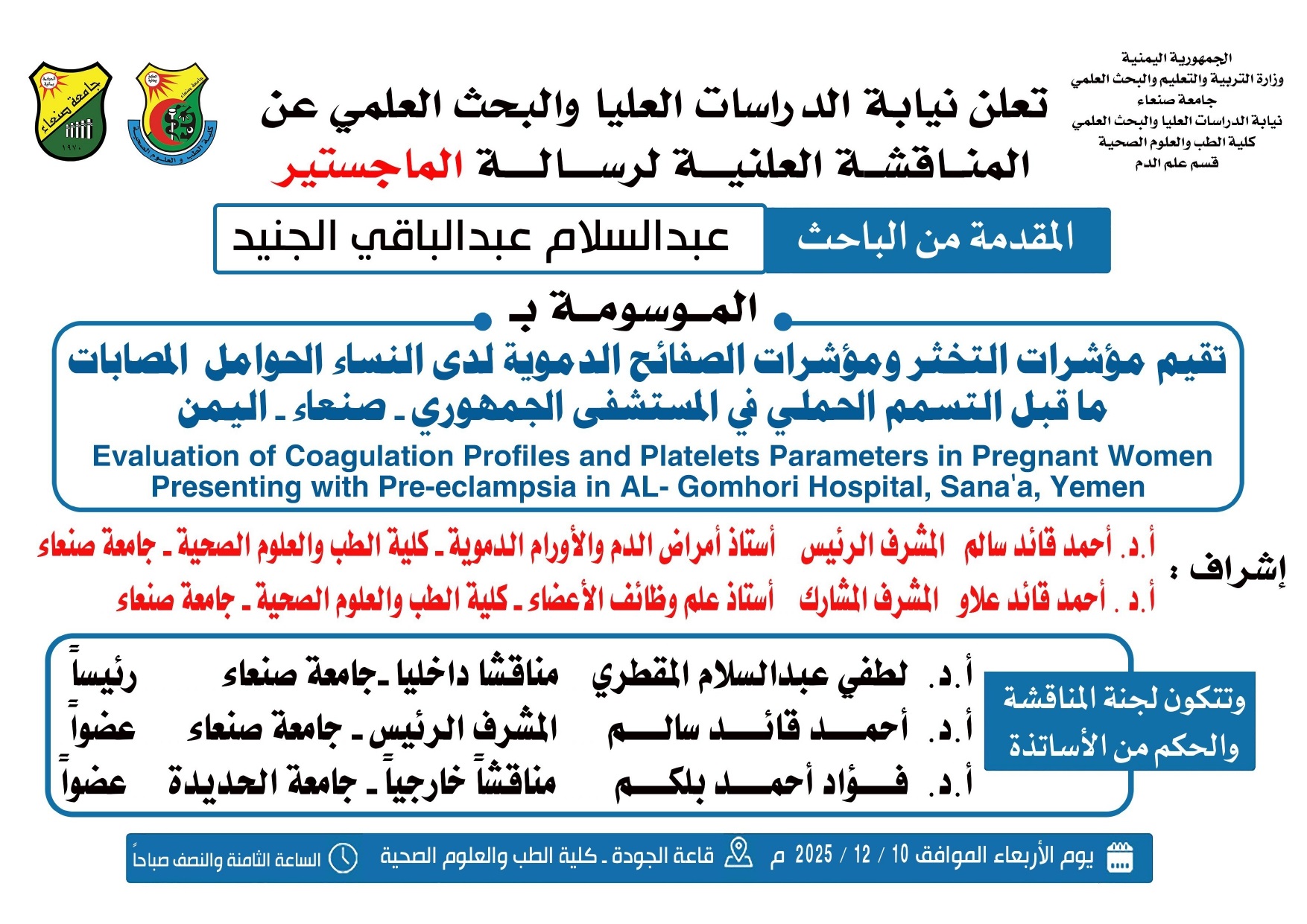 تعلن نيابة الدراسات العليا والبحث العلمي بجامعة صنعاء عن عقد المناقشة العلنية لرسالة الماجستير المقدمة من الباحث عبدالسلام عبدالباقي الجنيد ، قسم علم الدم بكلية الطب والعلوم الصحية.