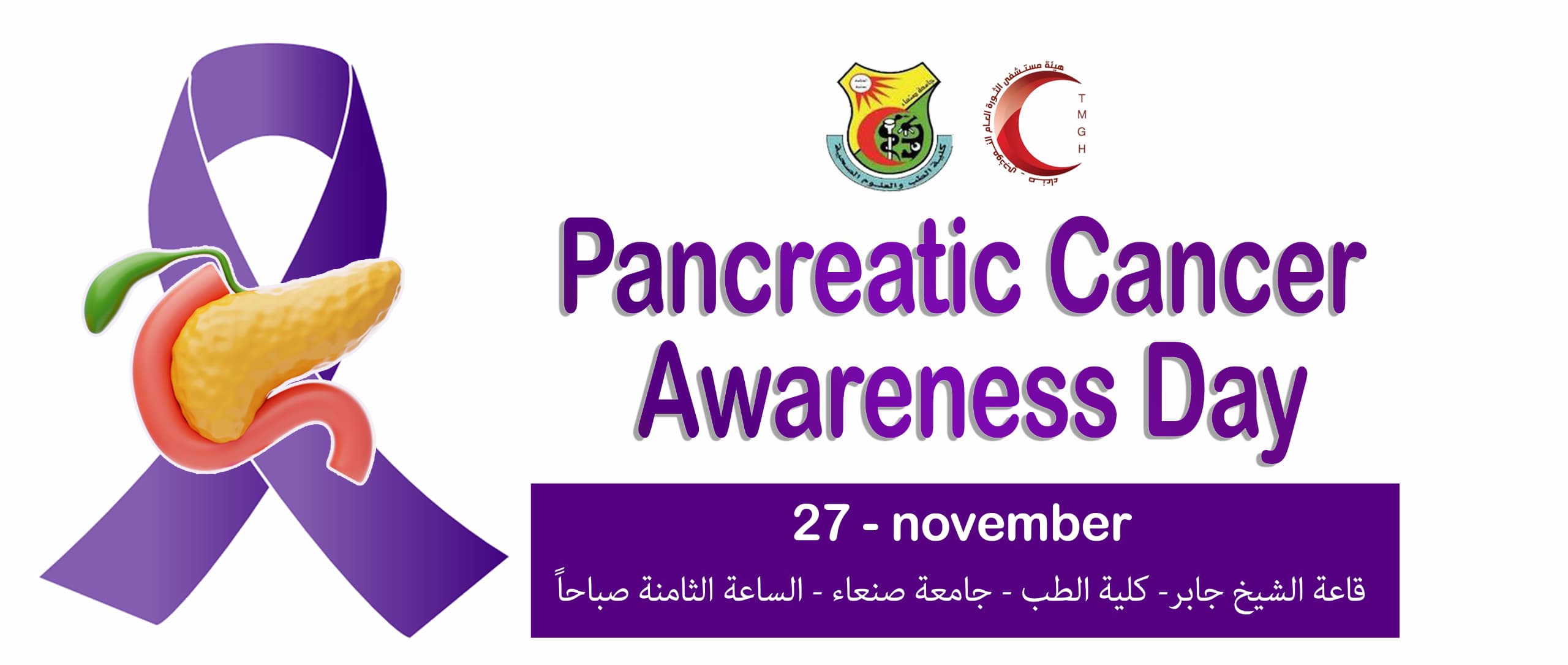 يسرّنا دعوتكم لحضور فعالية التوعية حول سرطان البنكرياس بتنظيم: كلية الطب – جامعة صنعاء مساق الجراحة العامة للبورد العربي واليمني وحدة الأورام – هيئة مستشفى الثورة التاريخ : 27 / 11 / 2025 المكان : قاعة جابر – كلية الطب …