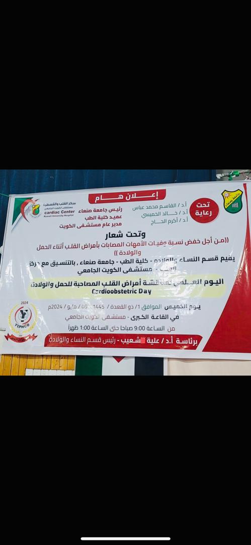 The Faculty of Medicine and Health Sciences at the Sana’a, University in collaboration between the Departments of Obstetrics and Gynecology and Cardiology and Cardiovascular, organized a successful scientific event at Kuwait University Hospital. This event aims to highlight the importance of reducing maternal heart disease-related deaths during the period of pregnancy and childbirth .