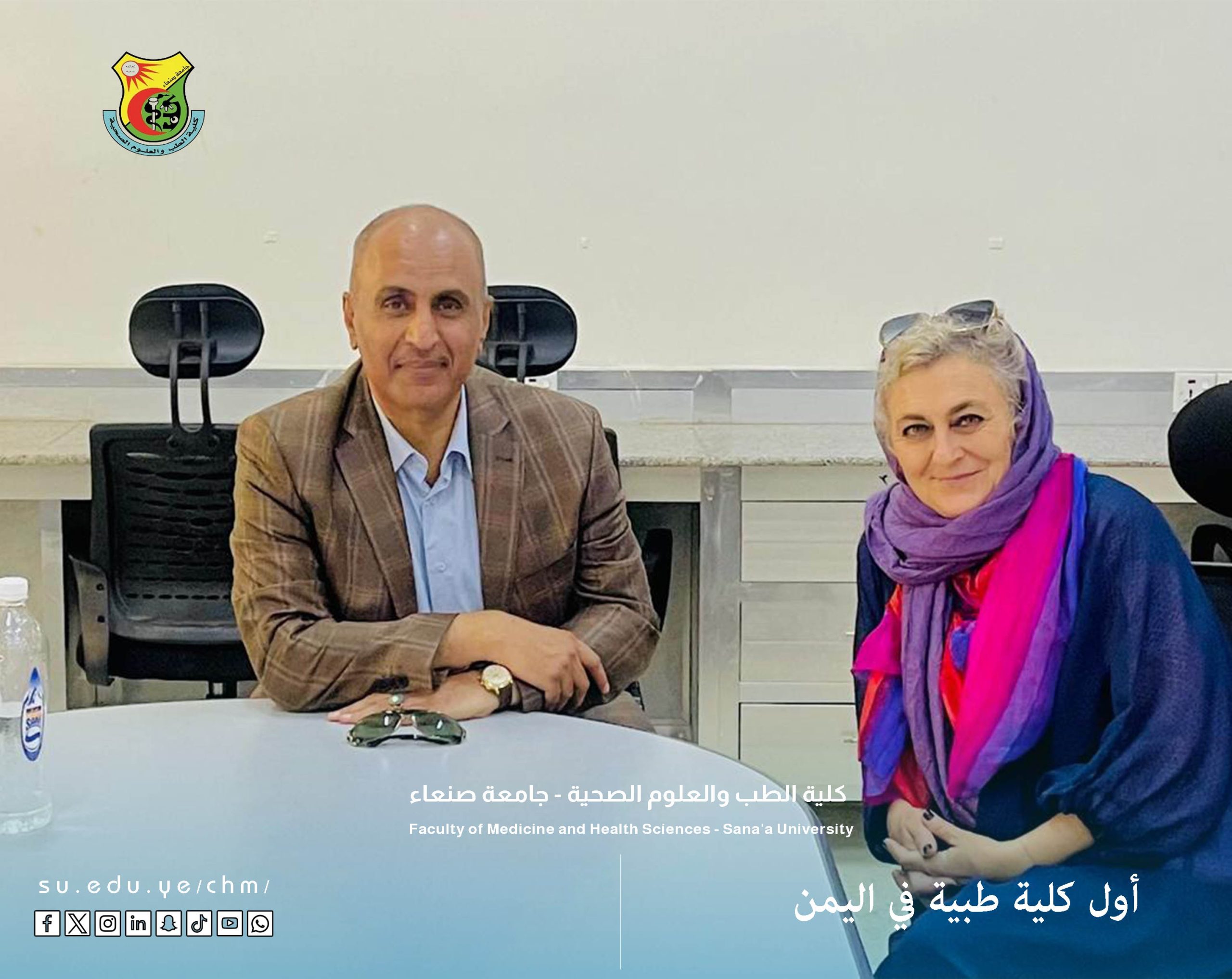 Sana’a – In an effort to enhance academic and professional collaboration, Ms. Freal Radi, Deputy Head of the International Committee of the Red Cross in Yemen, visited the Faculty of Medicine and Health Sciences at Sana’a University this morning. She was welcomed by Dr. Khaled Al-Khamesy the Dean of the Faculty .