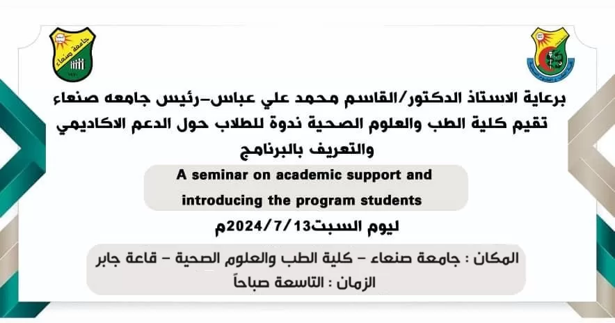 Under the patronage of Prof. Dr. / Al-Qassim Mohammed Ali Abbas – President of Sana’a University The Faculty of Medicine and Health Sciences holds (A seminar for the students on Academic Support and Introducing the Program) Day: Saturday . Date: …
