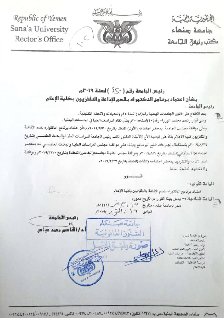 - أن يكون المتقدم حاصلاً على درجة الماجستير (في الإعلام من قسم الإذاعة والتليفزيون) بتقدير عام لا يقل عن (جيد جداً) من إحدى الجامعات اليمنية أو جامعة معترف بها.