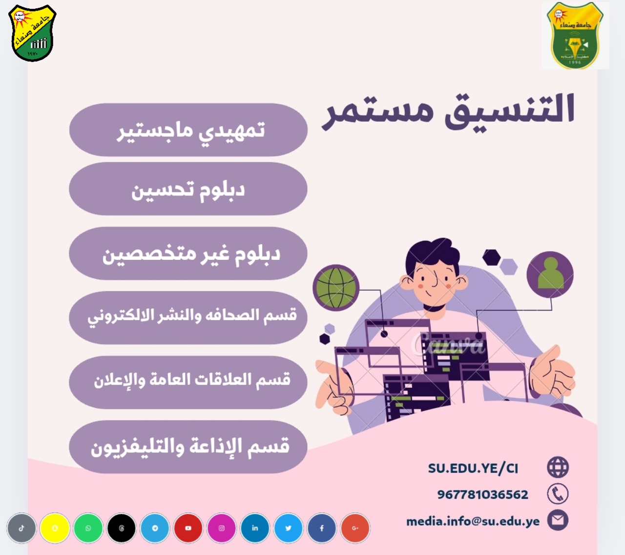 كلية الإعلام بجامعة صنعاء تمدد فترة التنسيق في برامج الدراسات العليا.