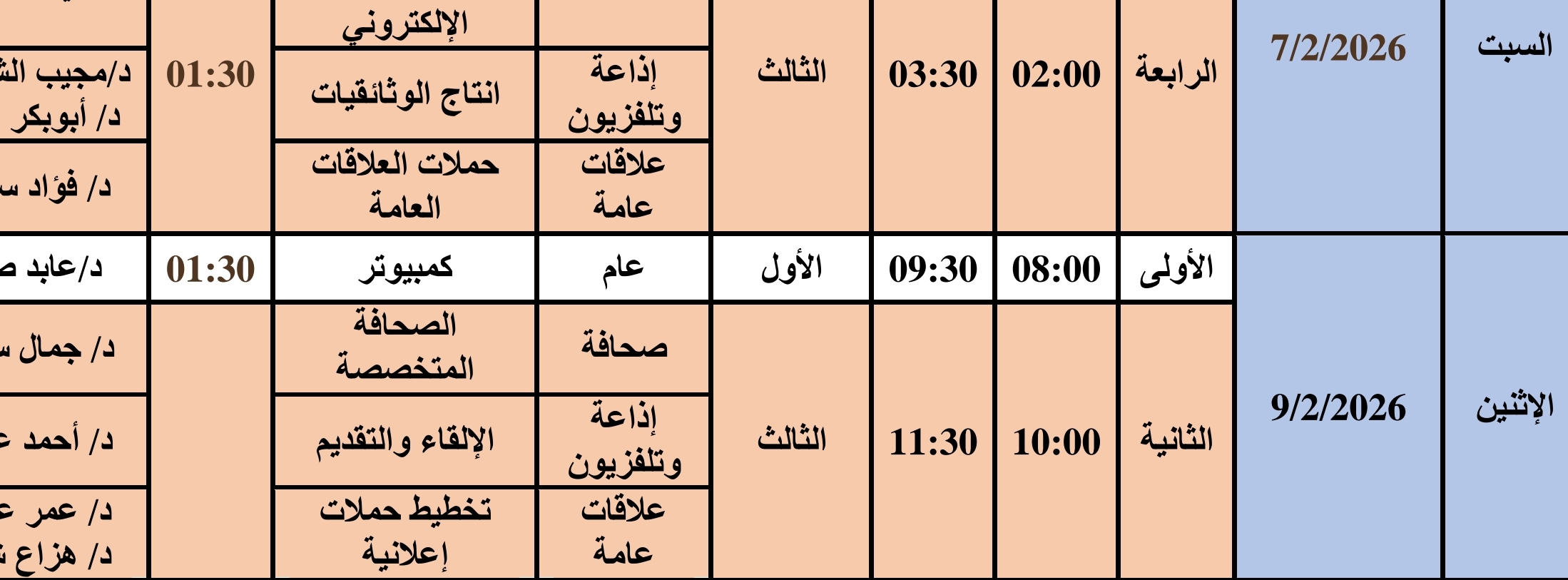 تنوه كلية الإعلام إلى أن اختبارات المستوى الثالث ليوم غدٍ الاثنين ستُعقد في الفترة الثانية عند الساعة العاشرة صباحًا، وذلك وفقًا للجدول المعتمد من الكلية والمركز الامتحاني.