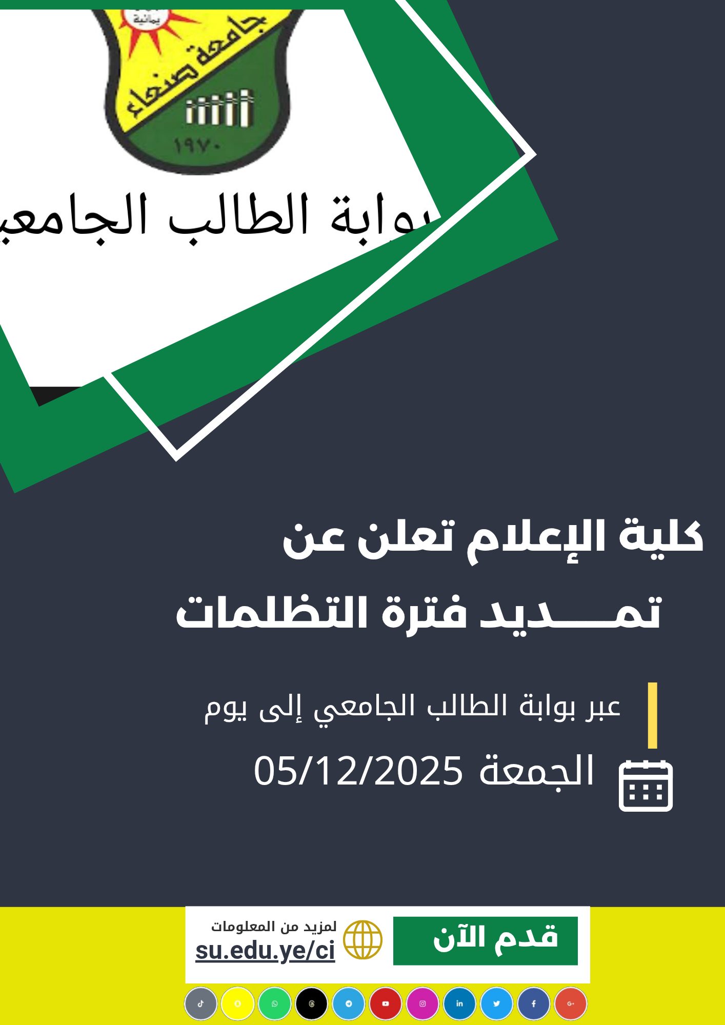 Sana’a University’s Faculty of Mass Communication Extends First Semester Academic Appeal Submission Period Thursday, November 27, 2025 Faculty of Mass Communication at Sana’a University has extended the deadline for students to submit academic appeals for the First Semester until the …