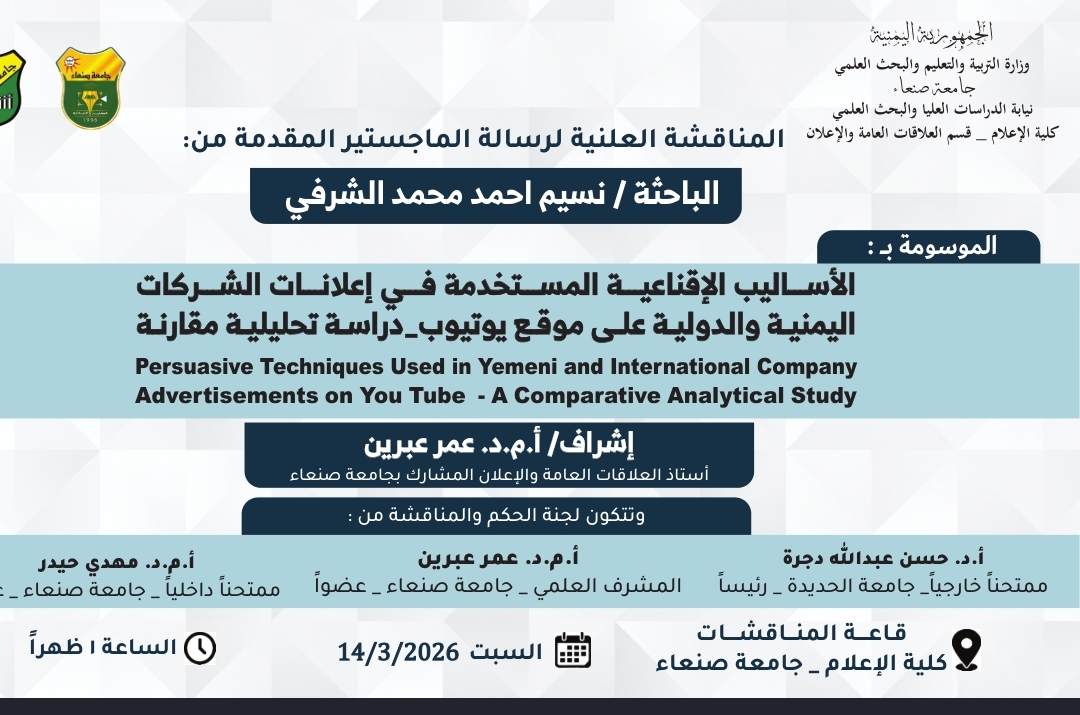 الماجستير بامتياز للباحثة نسيم أحمد محمد الشرفي من قسم العلاقات العامة والإعلان. للمزيد من التفاصيل عبر الرابط التالي https://youtu.be/1Idgk0XACcw?si=4eK4ctWDazhxD_eY