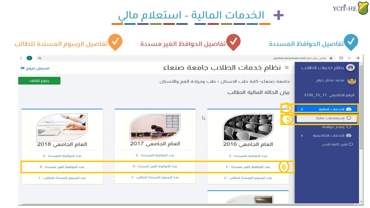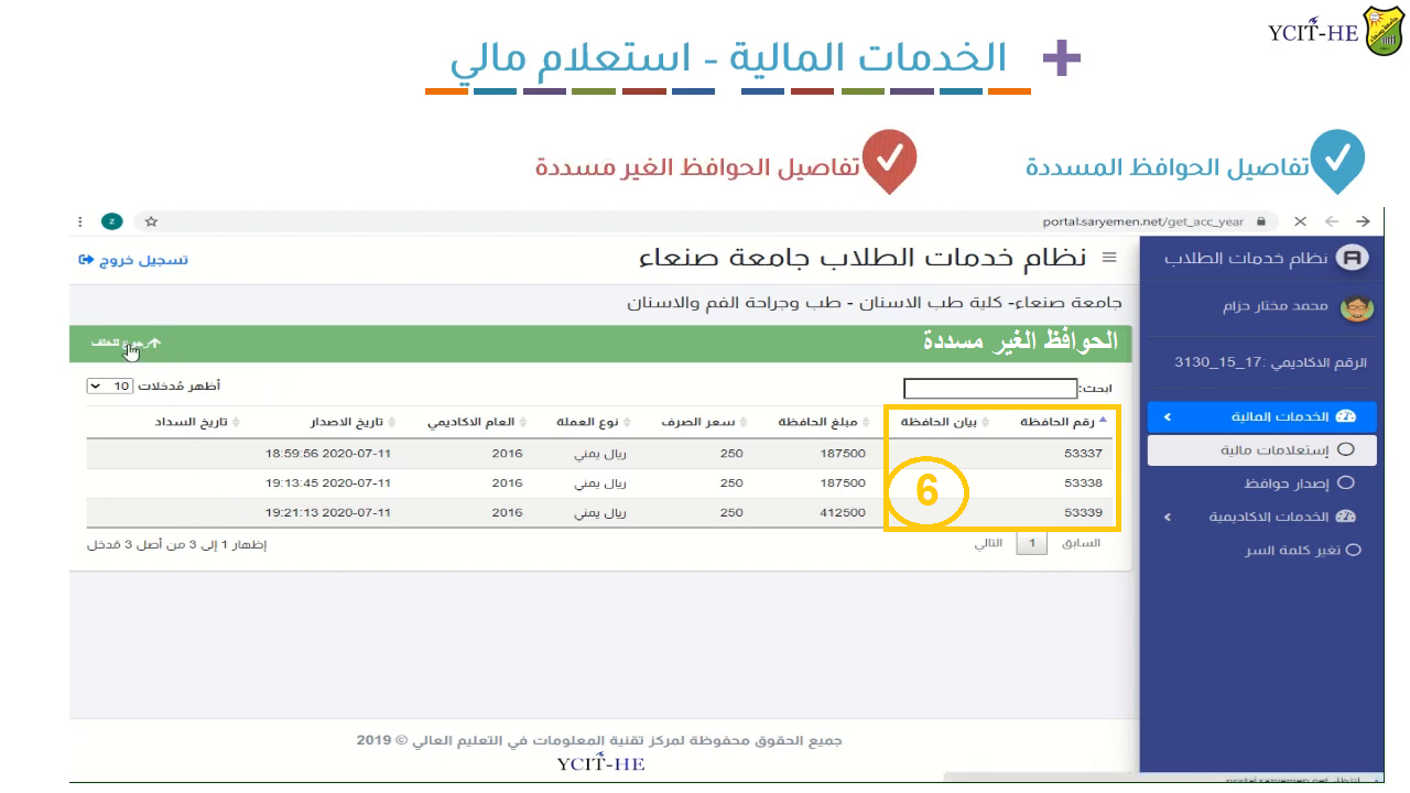 ولمعرفة الرسوم المقررة وأرقام الحوافظ على كل طالب الدخول عبر تطبيق الجامعة إلى بوابة الطالب الجامعية ثم الانتقال إلى خدمات مالية ثم الانتقال إلى استعلامات مالية ثم انتقال إلى الحوافظ غير المسددة ثم تسديدها.