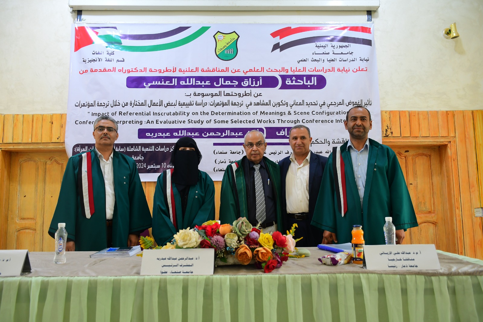 نالت الباحثة/ أرزاق جمال عبد الله العنسي درجة الدكتوراه في قسم (اللغة الإنجليزية) تخصص (دراسات ترجمة) كلية (اللغات) بجامعة صنعاء عن رسالتها الموسومة بـ: (تأثير الغموض المرجعي في تحديد المعاني وتكوين المشاهد في ترجمة المؤتمرات: دراسة تقييمية لبعض الأعمال المختارة من خلال ترجمة المؤتمرات)