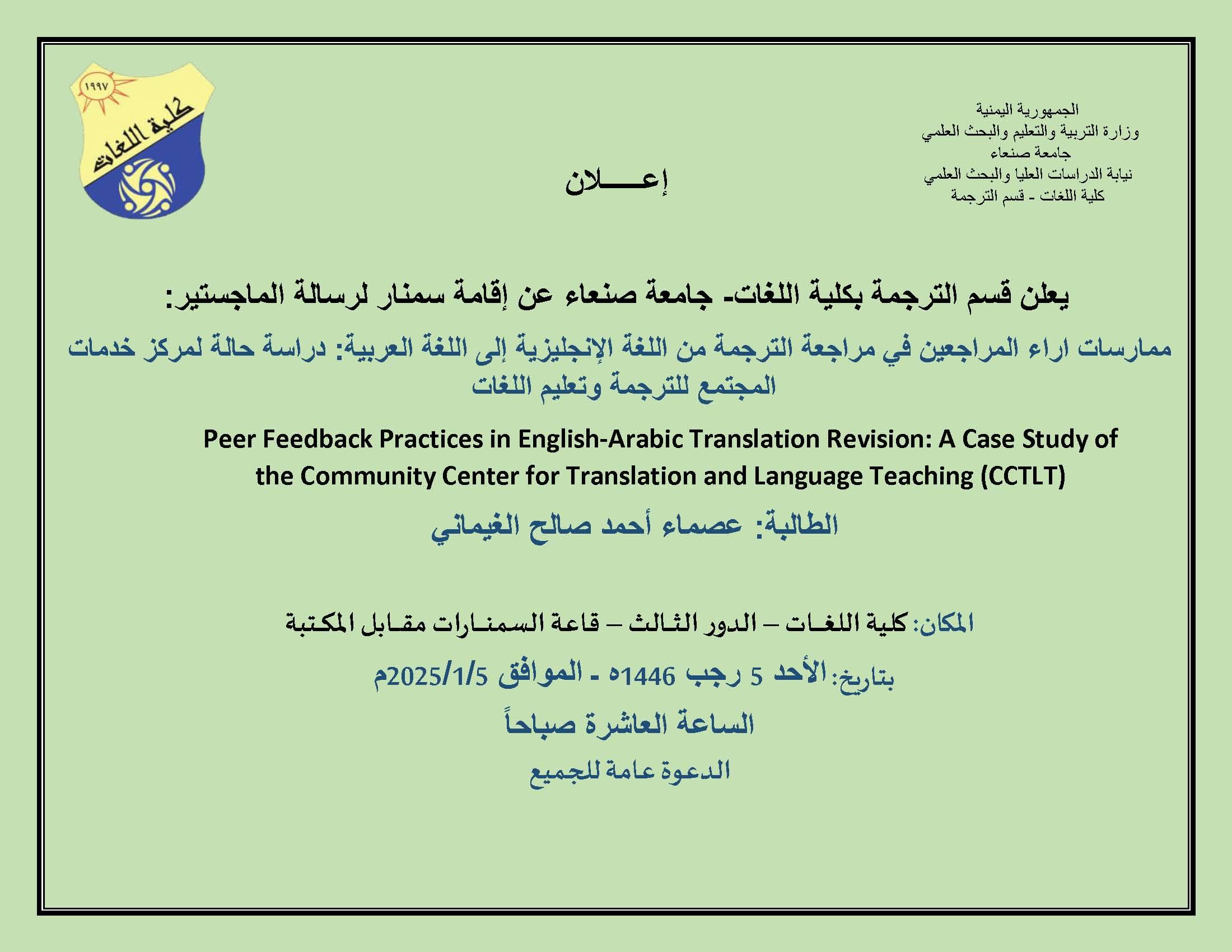 إعلان إقامة سمنار لرسالة الماجستير للطالبة: عصماء أحمد صالح الغيماني Posted by كلية اللغات جامعة الصنع التصنيفات الأخبار Date يناير 4, 2025 يعلن قسم الترجمة بكلية اللغات – جامعة صنعاء عن إقامة سمنار لرسالة الماجستير بعنوان: ممارسات اراء المراجعين في مراجعة الترجمة من اللغة الإنجليزية إلى اللغة العربية: دراسة حالة لمركز خدمات المجتمع للترجمة وتعليم اللغات Peer Feedback Practices in English-Arabic Translation Revision: A Case Study of the Community Center for Translation and Language Teaching (CCTLT) الطالبة/ عصماء أحمد صالح الغيماني المكان: كلية اللغات – الدور الثالث – قاعة السمنارات مقابل المكتبة الزمان: الأحد 5 رجب 1446هـ ـ الموافق 2025/01/05م الساعة العاشرة صباحاً الدعوة عامة للجميع Share: كلية اللغات جامعة الصنع المقال السابق إعلان إقامة سمنار لرسالة الماجستير للطالبة: هاجر ناجي محمد القطيبي يناير 4, 2025 المقال التالي تعلن نيابة الدراسات العليا والبحث العلمي عن المناقشة العلنية لأطروحة الدكتوراه المقدمة من الطالبة/ مرام صالح احمد الشريف يناير 7, 2025 You may also like قسم اللغة الانجليزية بكلية اللغات بجامعة صنعاء يناقش خطة رسالة الماجستير للباحث جهاد محسن أحمد سلمان 19 فبراير, 2026 قسم اللغة الانجليزية بكلية اللغات بجامعة صنعاء يناقش خطة رسالة الماجستير للباحث داوود حميد عبده حمود 19 فبراير, 2026 قسم الترجمة بكلية اللغات بجامعة صنعاء يناقش خطة رسالة الماجستير للباحثة عالية عبدالقوي سفيان الشرفي 15 فبراير, 2026