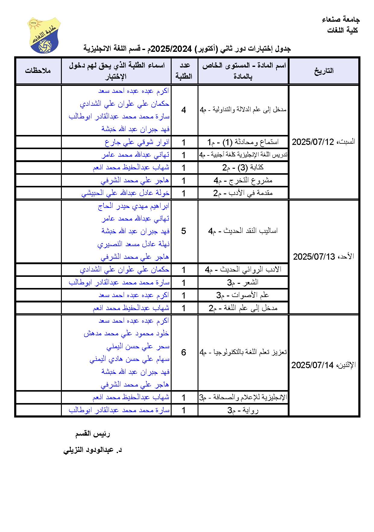 جدول إختبارات دور ثاني (أكتوبر) للعام الجامعي 2024-2025م – مع اسماء الطلاب – قسم اللغة الانجليزية