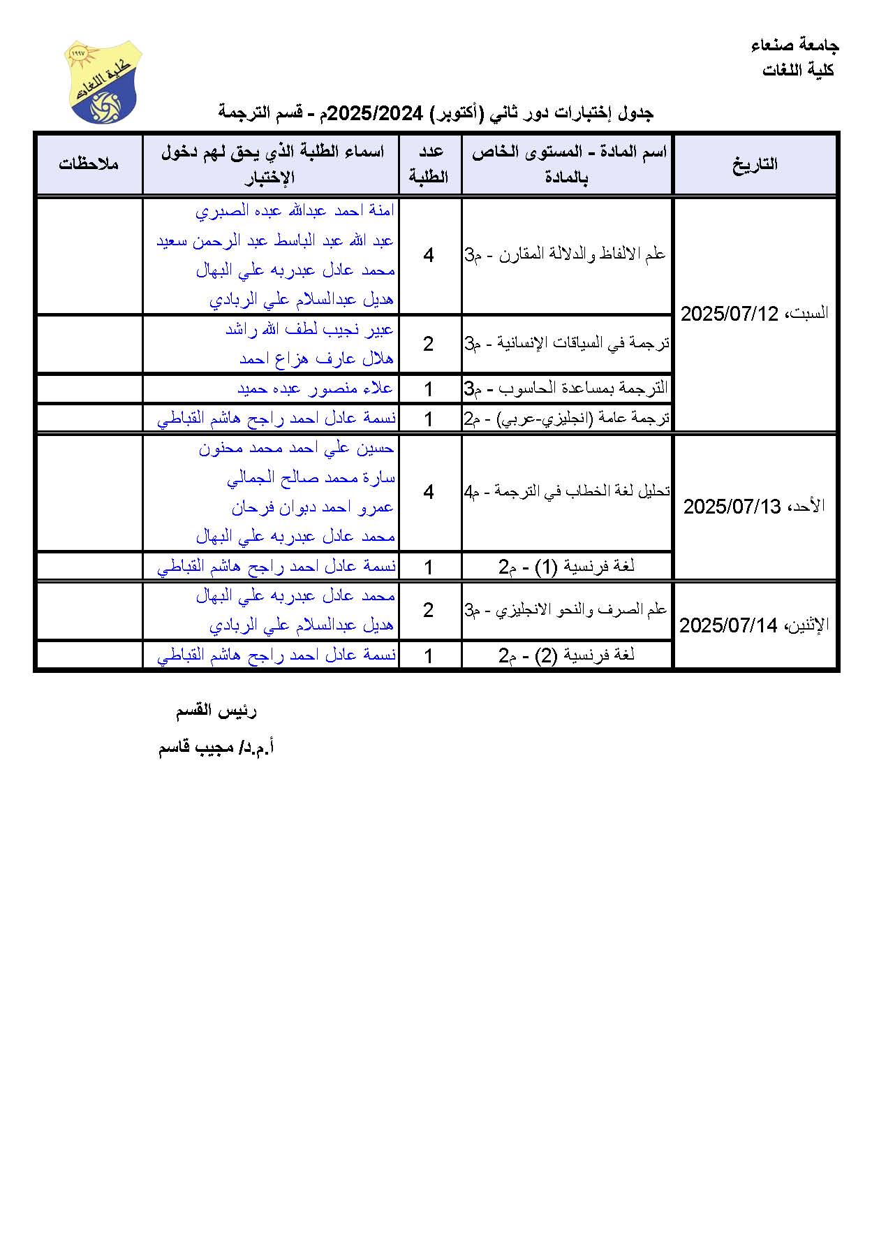 جدول إختبارات دور ثاني (أكتوبر) للعام الجامعي 2024-2025م – مع اسماء الطلاب – قسم الترجمة