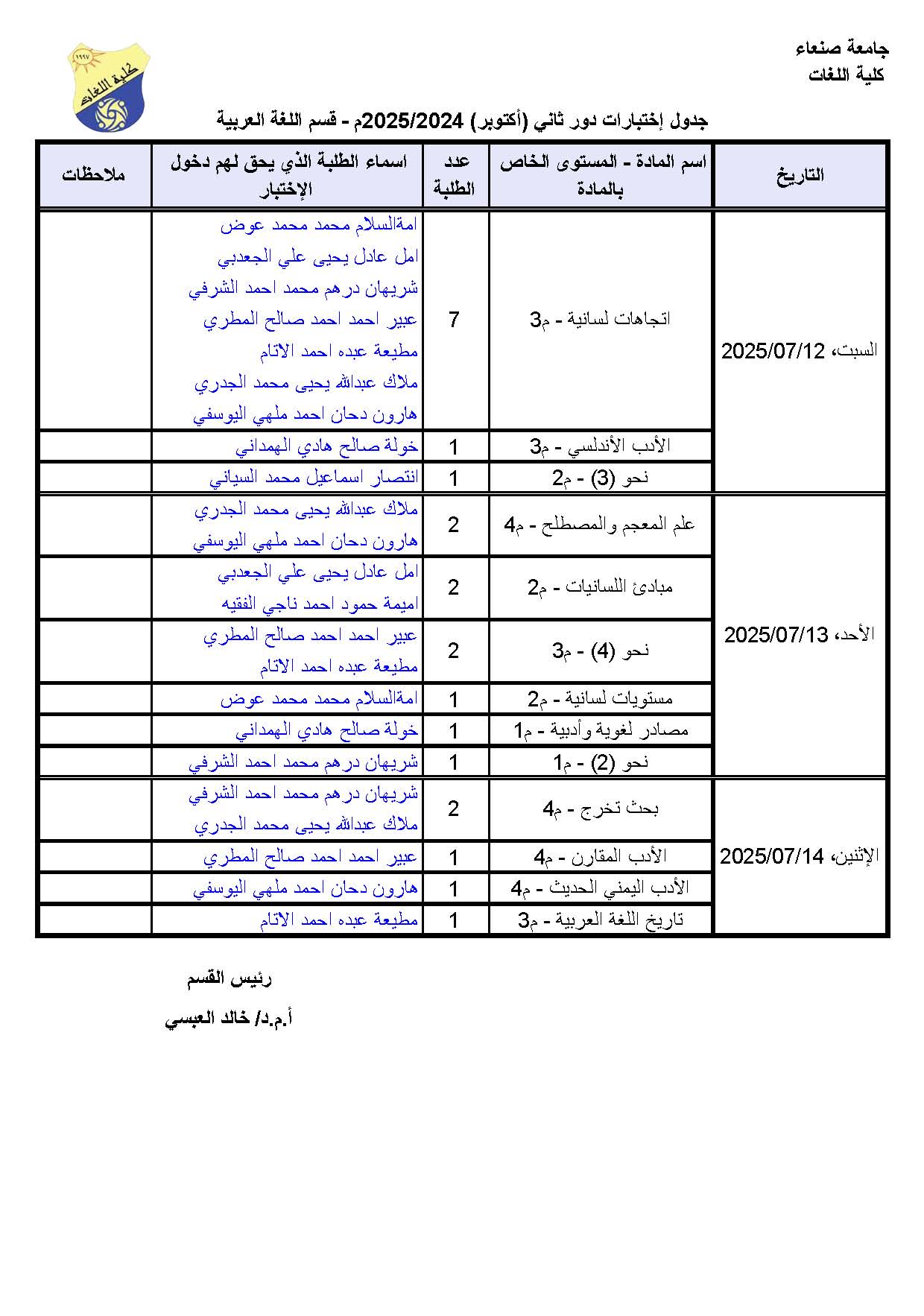 جدول إختبارات دور ثاني (أكتوبر) للعام الجامعي 2024-2025م – مع اسماء الطلاب – قسم اللغة العربية