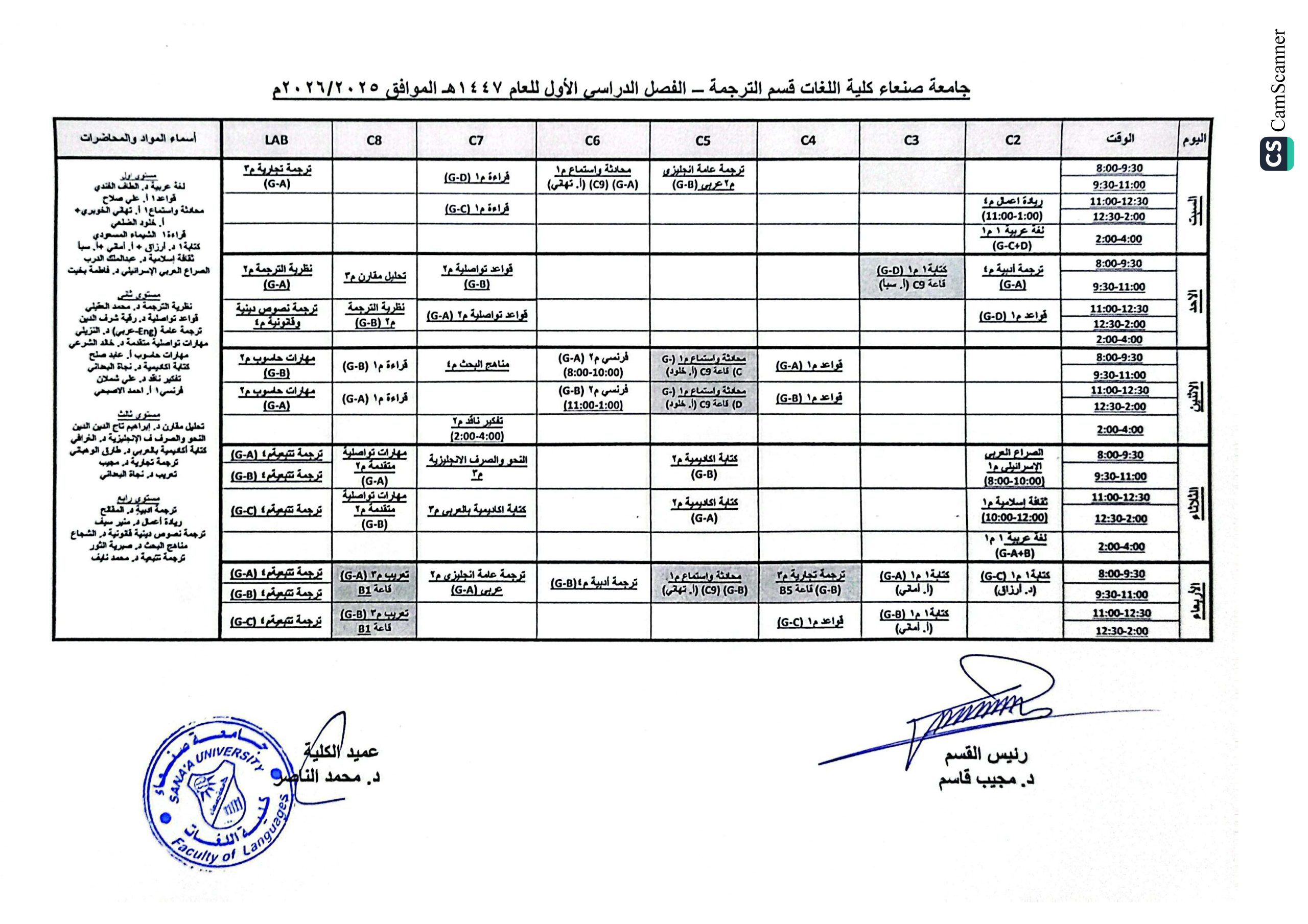 جدول قسم الترجمة