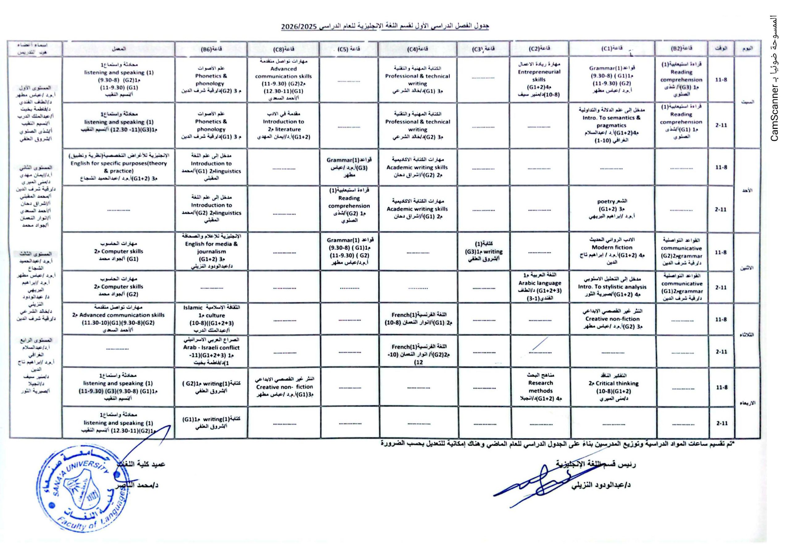 جدول قسم اللغة الانجليزية