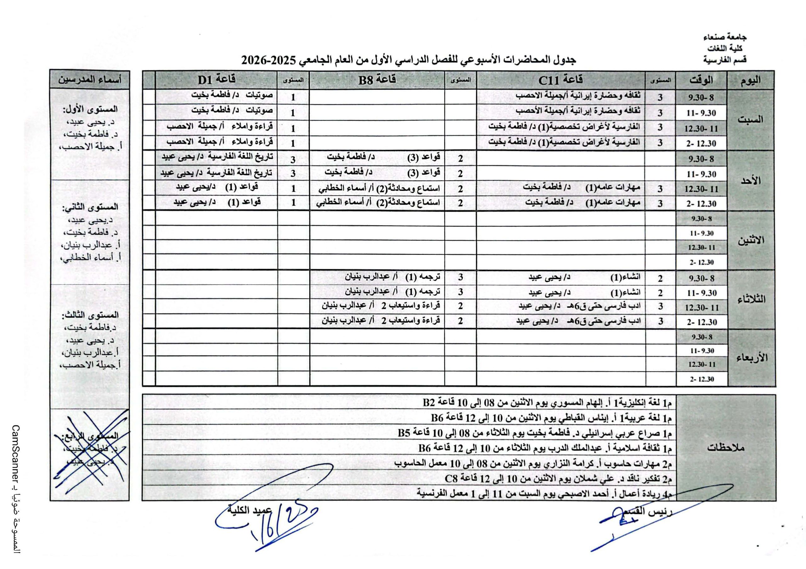 جدول قسم اللغة الفارسية