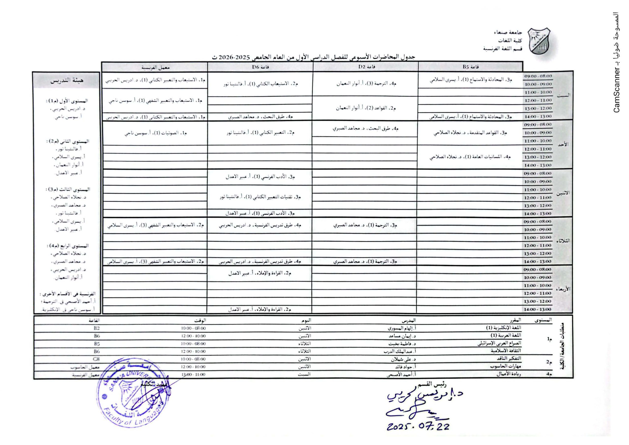 جدول قسم اللغة الفرنسية
