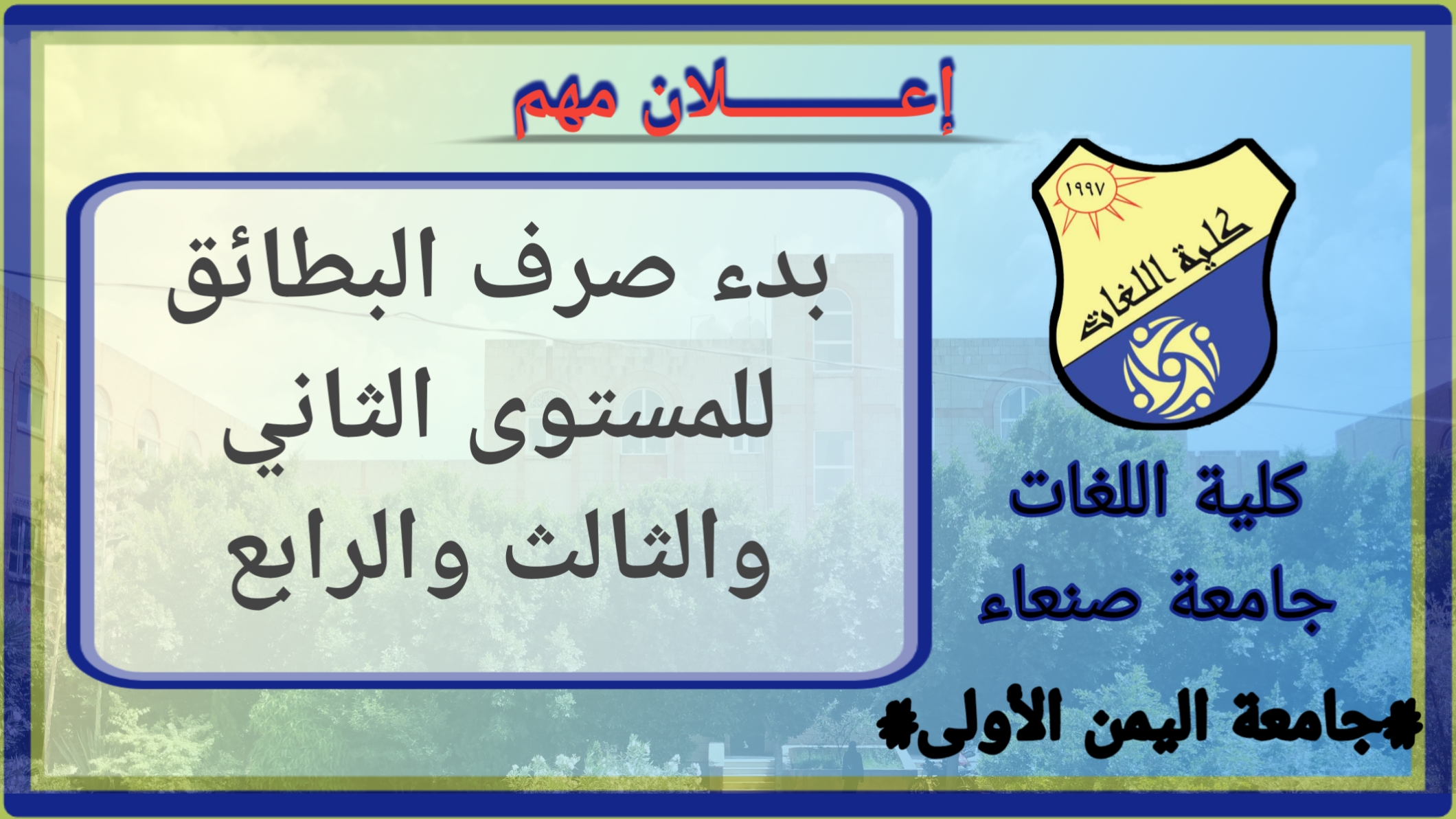 تُعلن كلية اللغات عن بدء صرف بطائق الطلاب للمستويات الثاني والثالث والرابع للعام الجامعي 1447هـ / 2025–2026م وذلك ابتداءً من يوم السبت 28 ربيع أول 1447هـ الموافق 20 سبتمبر 2025م.