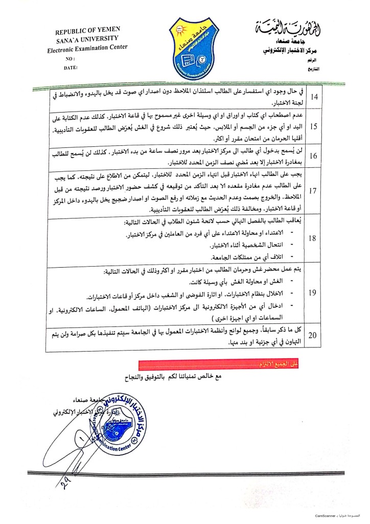 - يمنع منعاً باتاً إدخال أو تعاطي القات أو أي مشروبات أخرى داخل مركز الاختبار عدى الماء وفي حال عدم الالتزام، فسيعتبر ذلك إخلالاً بنظام الاختبار، ويُعرض الطالب للعقوبات التأديبية.
