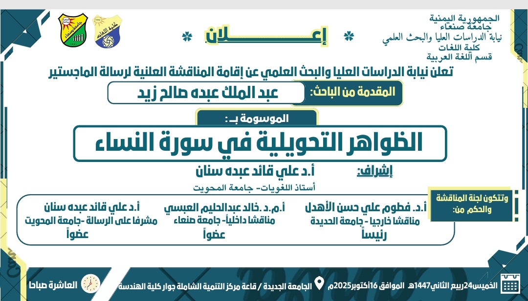 المناقشة العلنية لرسالة الماجستير المقدمة من الباحث عبدالملك زيد