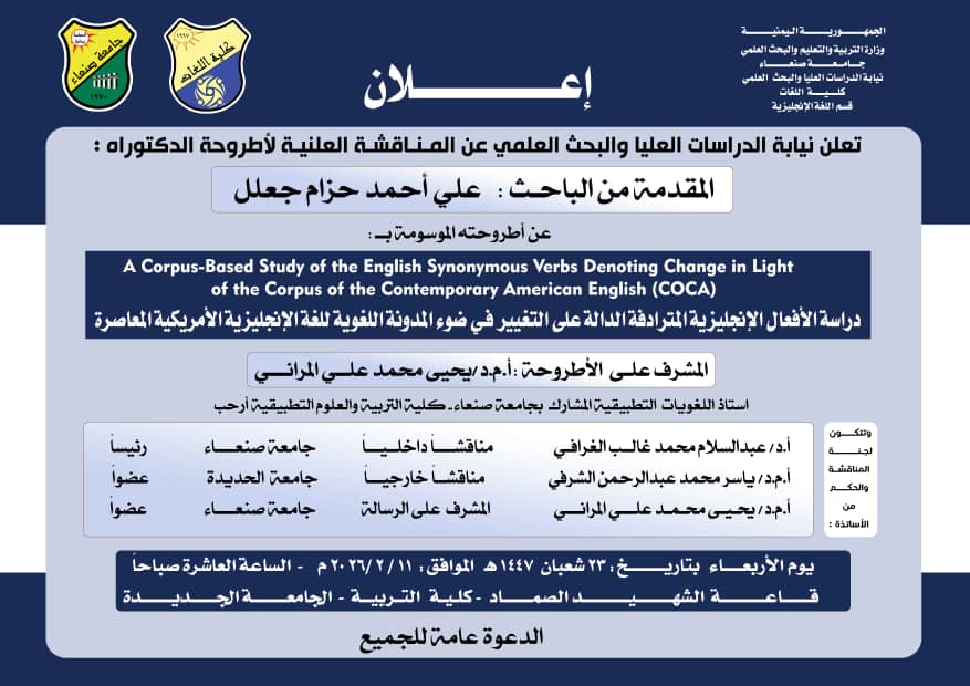 المناقشة العلنية لأطروحة الدكتوراه المقدَّمة من الباحث علي احمد حزام جعلل