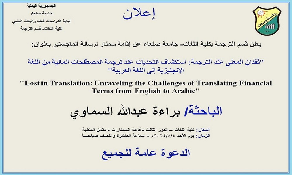 يعلن قسم الترجمة بكلية اللغات – جامعة صنعاء عن إقامة سمنار لرسالة الماجستير بعنوان: فقدان المعنى عند الترجمة: استكشاف التحديات عند ترجمة المصطلحات المالية من اللغة الإنجليزية إلى اللغة العربية Lost in Translation: Unraveling the Challenges of Translating Financial Terms …