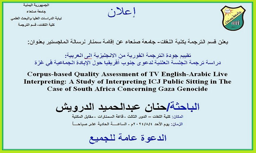 يعلن قسم الترجمة بكلية اللغات – جامعة صنعاء عن إقامة سمنار لرسالة الماجستير بعنوان: تقييم جودة الترجمة الفورية من الانجليزية إلى العربية: دراسة ترجمة الجلسة العلنية لدعوى جنوب أفريقيا حول الإبادة الجماعية في غزة Corpus-based Quality Assessment of TV English-Arabic …