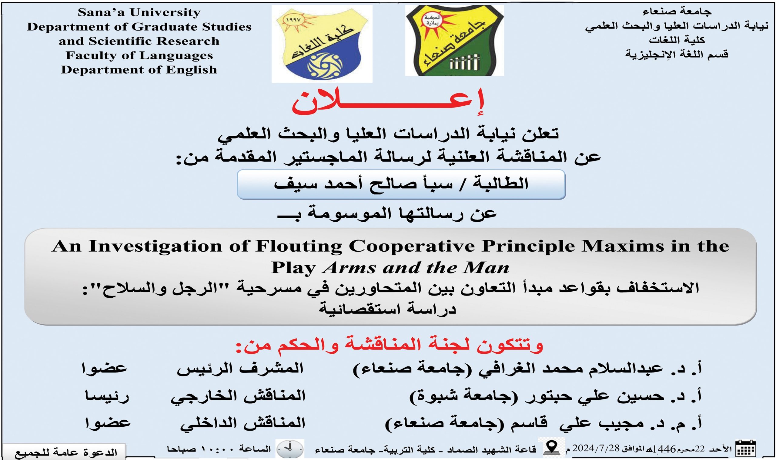 تعلن نيابة الدراسات العليا والبحث العلمي عن المناقشة العلنية لرسالة الماجستير المقدمة من الباحثة: سبأ صالح أحمد سيف عن رسالتها الموسومة بـــ: الاستخفاف بقواعد مبدأ التعاون بين المتحاورين في مسرحية “الرجل والسلاح”: دراسة استقصائية An Investigation of Flouting Cooperative Principle …