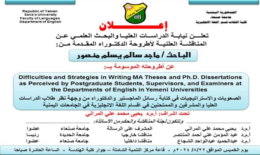 تعلــــن نيابــة الدراســات العليــا والبحــث العلمــي عــن المناقشــة العلنيــة لأطروحة الدكتــوراه المقــدمة مــن: الباحث/ ماجد سالم يسلم منصور عن أطروحته الموسومة بــ: Difficulties and Strategies in Writing MA Theses and Ph.D. Dissertations as Perceived by Postgraduate Students, Supervisors, and Examiners …