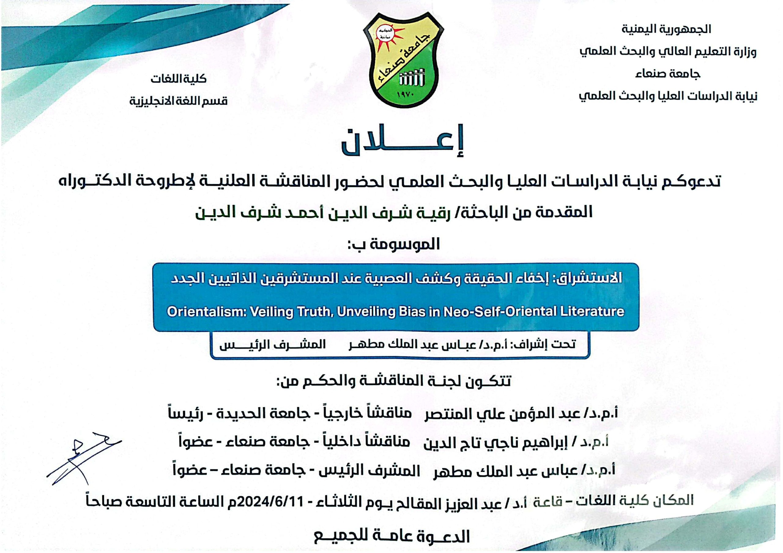 نالت الباحثة/ رقية شرف الدين أحمد شرف الدين درجة الدكتوراة – تخصص أدب انجليزي/ استشراق بتقدير ممتاز مع مرتبة الشرف من كلية اللغات – جامعة صنعاء عن أطروحتها الموسومة بـ: “الاستشراق: إخفاء الحقيقة وافشاء العصبية عند المستشرقين الذاتيين الجدد” “Orientalism: …
