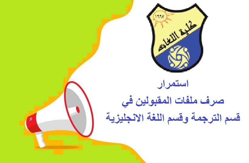 تتواصل إجراءات صرف ملفات طلاب وطالبات كلية اللغات (النظام العام) الذي تم الإعلان عن قبولهم في قسم الترجمة وقسم اللغة الانجليزية حتى يوم الاثنين القادم 3/6/2024م بمقر كلية اللغات بالجامعة الجديدة.