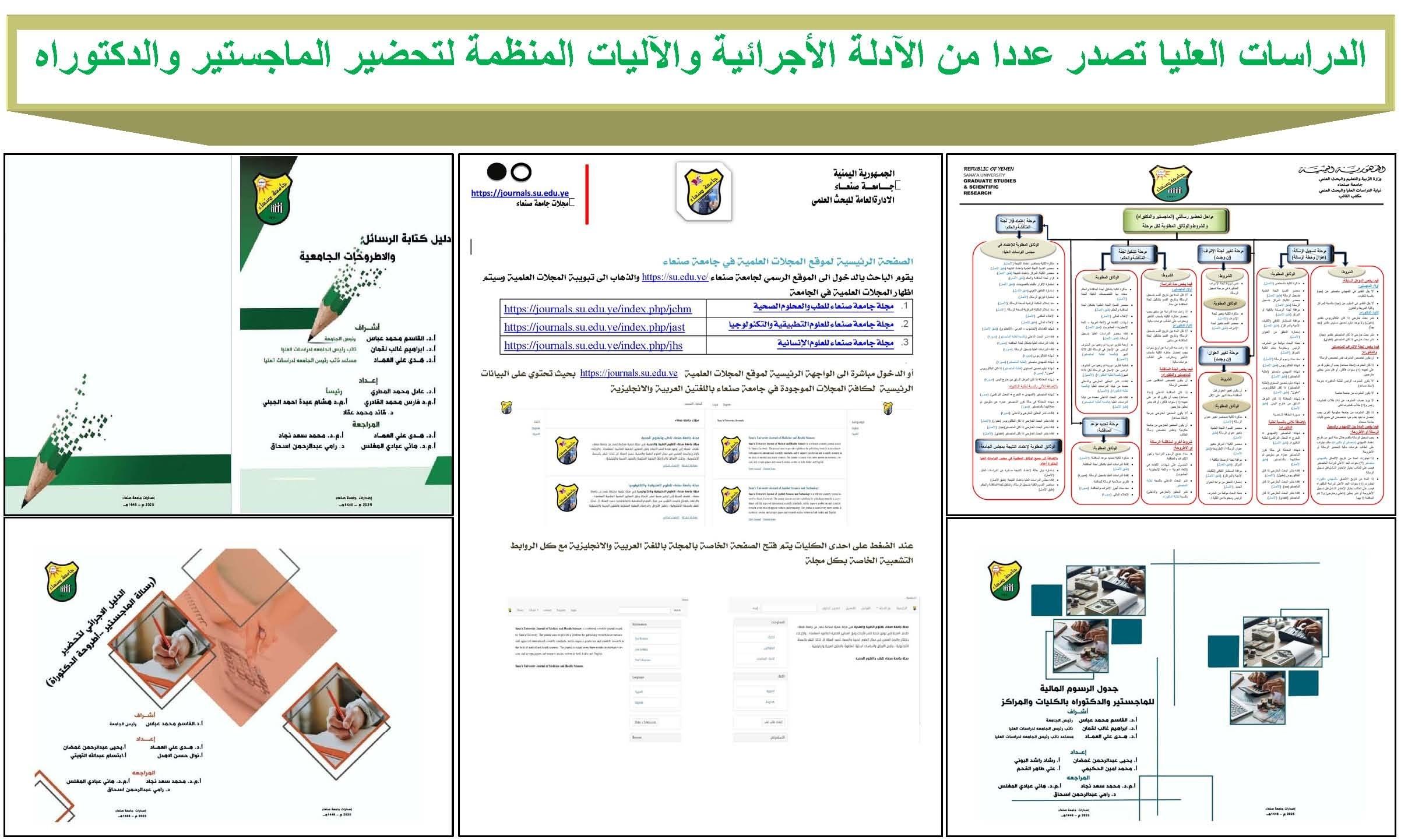 صدر عن نيابة رئاسة جامعة صنعاء للدراسات العليا والبحث العلمي مؤخرا عددا من الأدلة والمخططات التي تحدد الضوابط والشروط المتعلقة بإجراءات تحضير الدراسات العليا (ماجستير ودكتوراه) وكتابة الرسائل و الأطروحات والرسوم المالية، وآليات النشر في المجلات الجامعية. وتتمثل هذه الاصدارات …