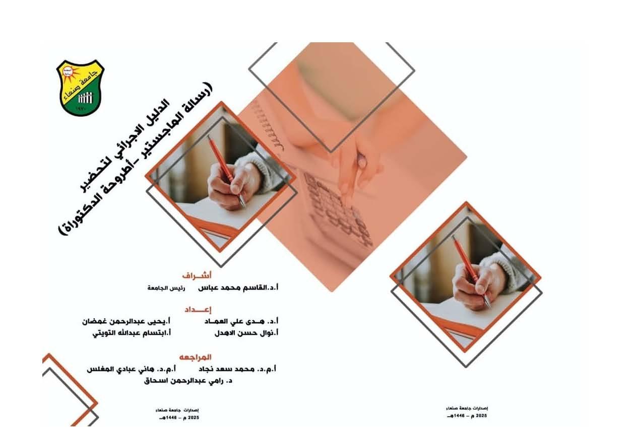 الدليل الإجرائي لتحضير رسالة الماجستير وأطروحة الدكتوراه. أنقر هنا لتحميل الدليل الإجرائي لتحضير رسالة الماجستير وأطروحة الدكتوراه بصيغة ملف pdf.