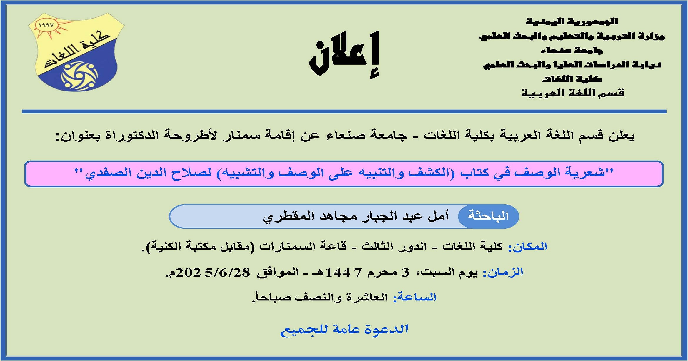 يُعلن قسم اللغة العربية بكلية اللغات – جامعة صنعاء عن إقامة سمنار لأطروحة الدكتوراة بعنوان: “شعرية الوصف في كتاب (الكشف والتنبيه على الوصف والتشبيه) لصلاح الدين الصفدي” الباحثة/ أمل عبد الجبار مجاهد المقطري المكان: كلية اللغات – الدور الثالث – …