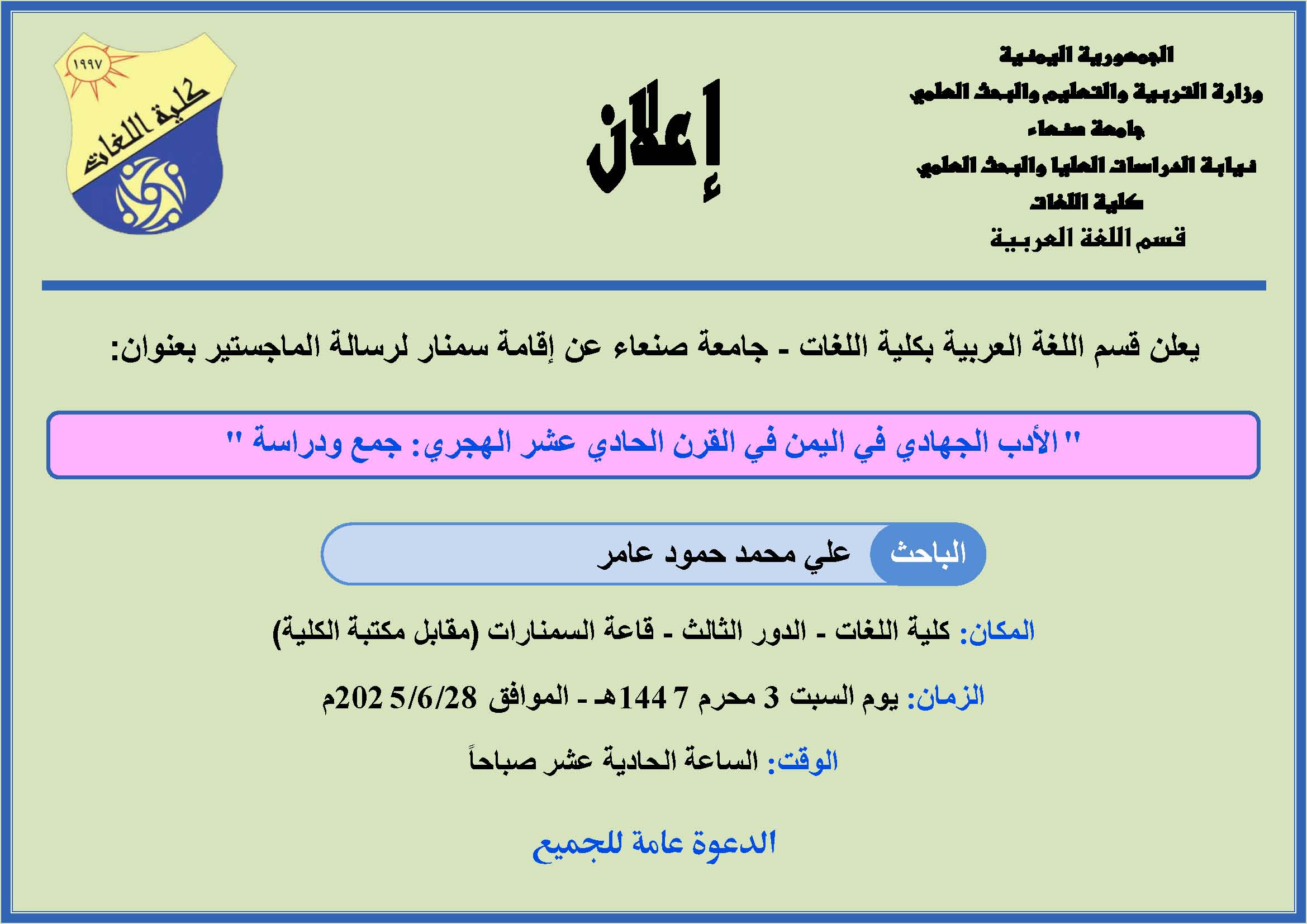 يُعلن قسم اللغة العربية بكلية اللغات – جامعة صنعاء عن إقامة سمنار لرسالة الماجستير بعنوان: “الأدب الجهادي في اليمن في القرن الحادي عشر الهجري: جمع ودراسة” الباحث/ علي محمد حمود عامر المكان: كلية اللغات – الدور الثالث – قاعة السمنارات …