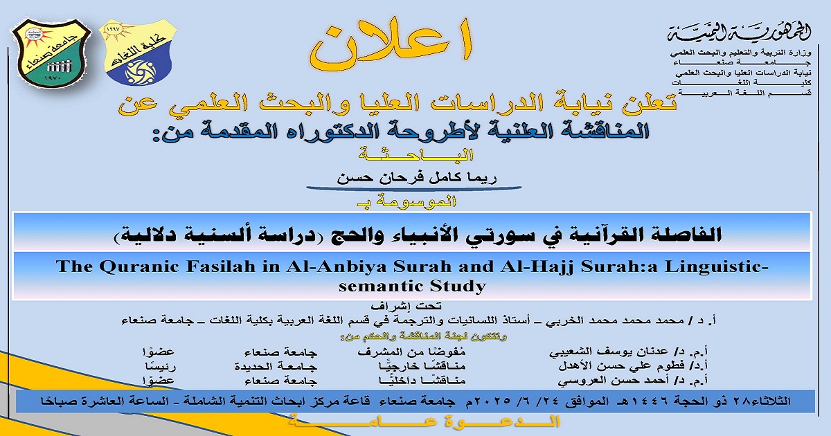 تعلن نيابة الدراسات العليا والبحث العلمي عن المناقشة العلنية لأطروحة الدكتوراة المقدمة من الباحثة: ريما كامل فرحان حسن عن أطروحتها الموسومة بـ: “الفاصلة القرآنية في سورتي الأنبياء والحج (دراسة السنية دلالية)” المشرف على الأطروحة: أ. د / محمد محمد محمد …