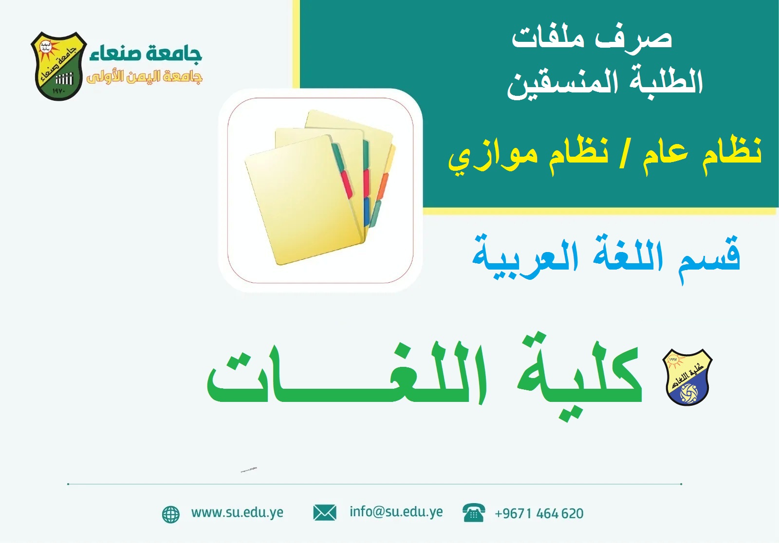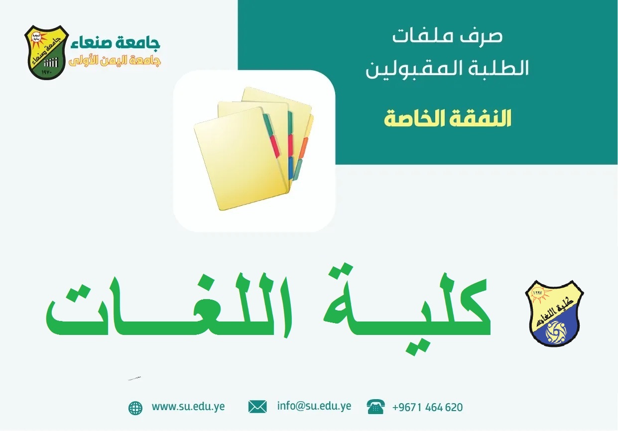 تعلن نيابة رئاسة الجامعة لشؤون الطلاب بجامعة صنعاء للطلاب المنسقين بكلية اللغات (نظام النفقة الخاصة) للعام الجامعي 1447هـ 2025/2026م، عن بدء عملية صرف الملفات وذلك من يوم الأربعاء 29 ذو الحجة 1446هـ الموافق 25 يونيو 2025م في مقر نيابة رئاسة …