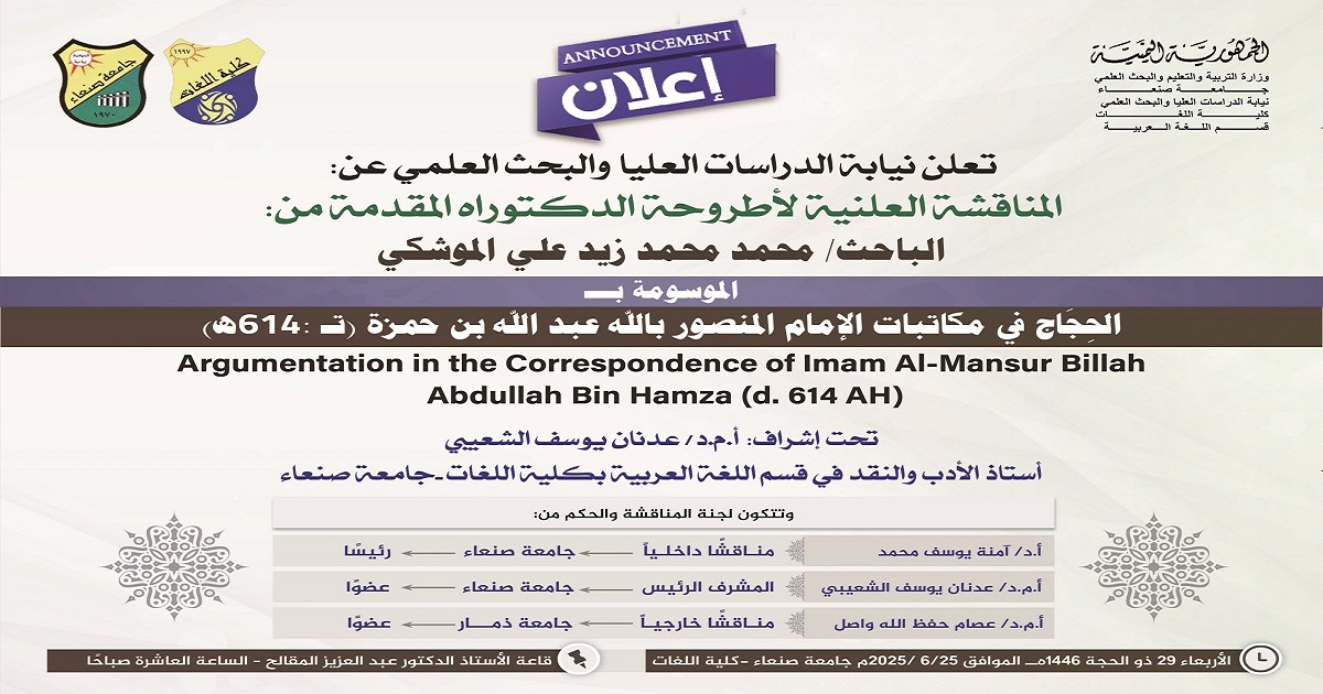 تعلن نيابة الدراسات العليا والبحث العلمي عن المناقشة العلنية لأطروحة الدكتوراة المقدمة من الباحث: محمد محمد زيد علي الموشكي عن اطروحته الموسومة بــ: “الحجاج في مكاتبات الإمام المنصور بالله عبد الله بن حمزة (تـ : 614هـ)” المشرف على الأطروحة: أ.م.د/ …