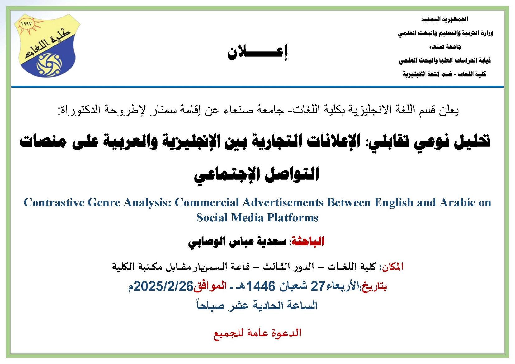 يعلن قسم اللغة الانجليزية بكلية اللغات – جامعة صنعاء عن إقامة سمنار لأطروحة الدكتوراة بعنوان: “تحليل نوعي تقابلي: الإعلانات التجارية بين الإنجليزية والعربية على منصات التواصل الإجتماعي” “Contrastive Genre Analysis: Commercial Advertisements Between English and Arabic on Social Media Platforms“ …