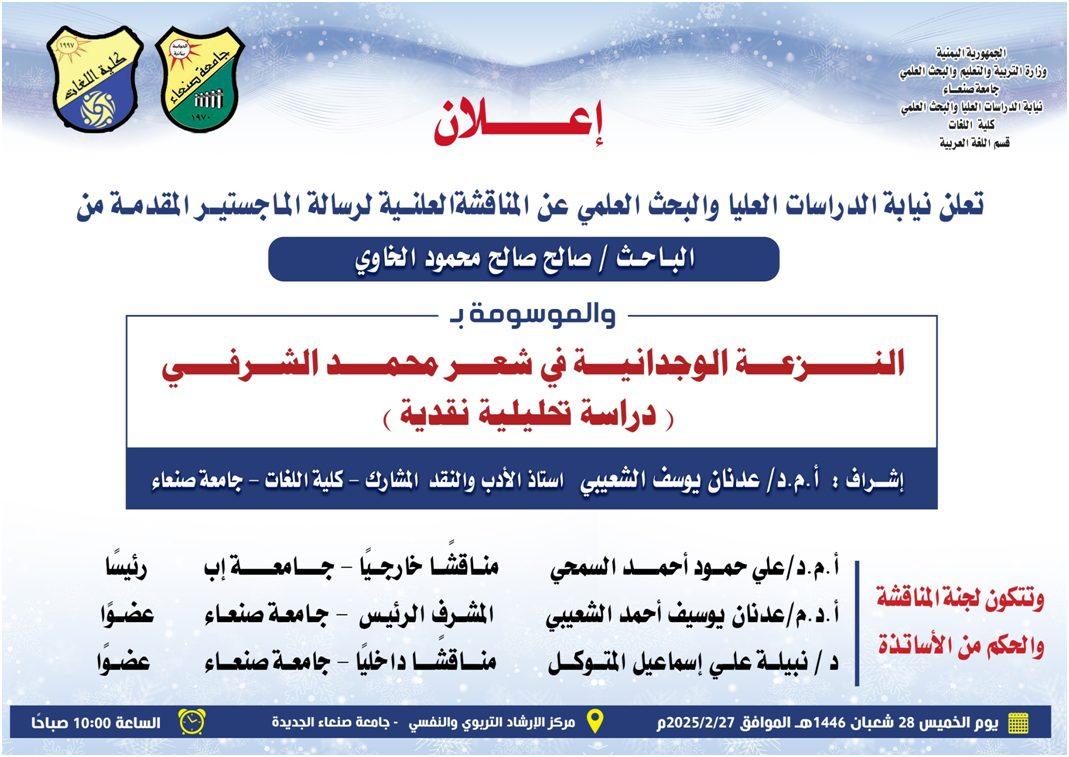 تعلن نيابة الدراسات العليا والبحث العلمي عن المناقشة العلنية لرسالة الماجستير المقدمة من الباحث: صالح صالح محمود الخاوي عن رسالته الموسومة بـ: النزعة الوجدانية في شعر محمد الشرفي (دراسة تحليلية نقدية) تحت إشراف: أ.م.د/ عدنان يوسف الشعيبي – استاذ الأدب …