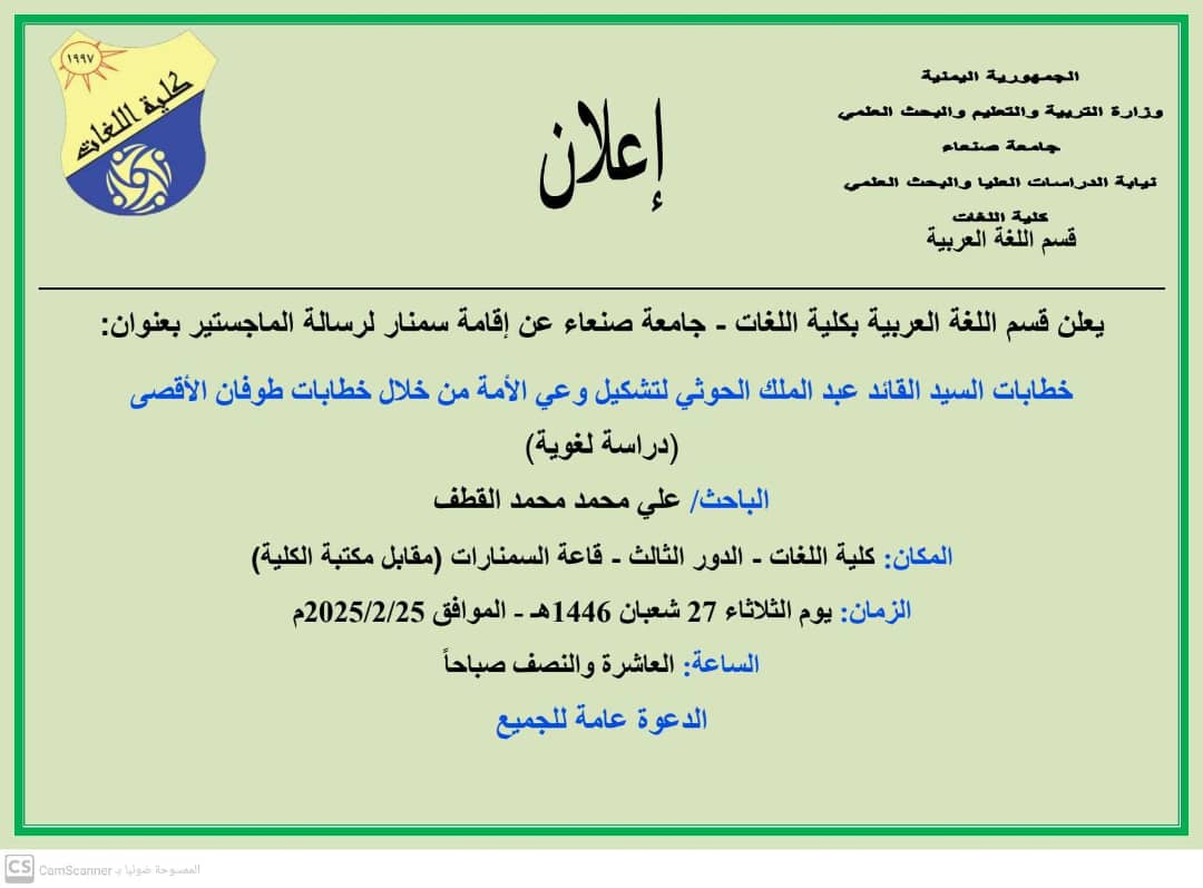 يعلن قسم اللغة العربية بكلية اللغات – جامعة صنعاء عن إقامة سمنار لرسالة الماجستير بعنوان: “خطابات السيد القائد عبد الملك الحوثي لتشكيل وعي الأمة من خلال خطابات طوفان الأقصى (دراسة لغوية)” الباحث/ علي محمد محمد القطف المكان: كلية اللغات – …